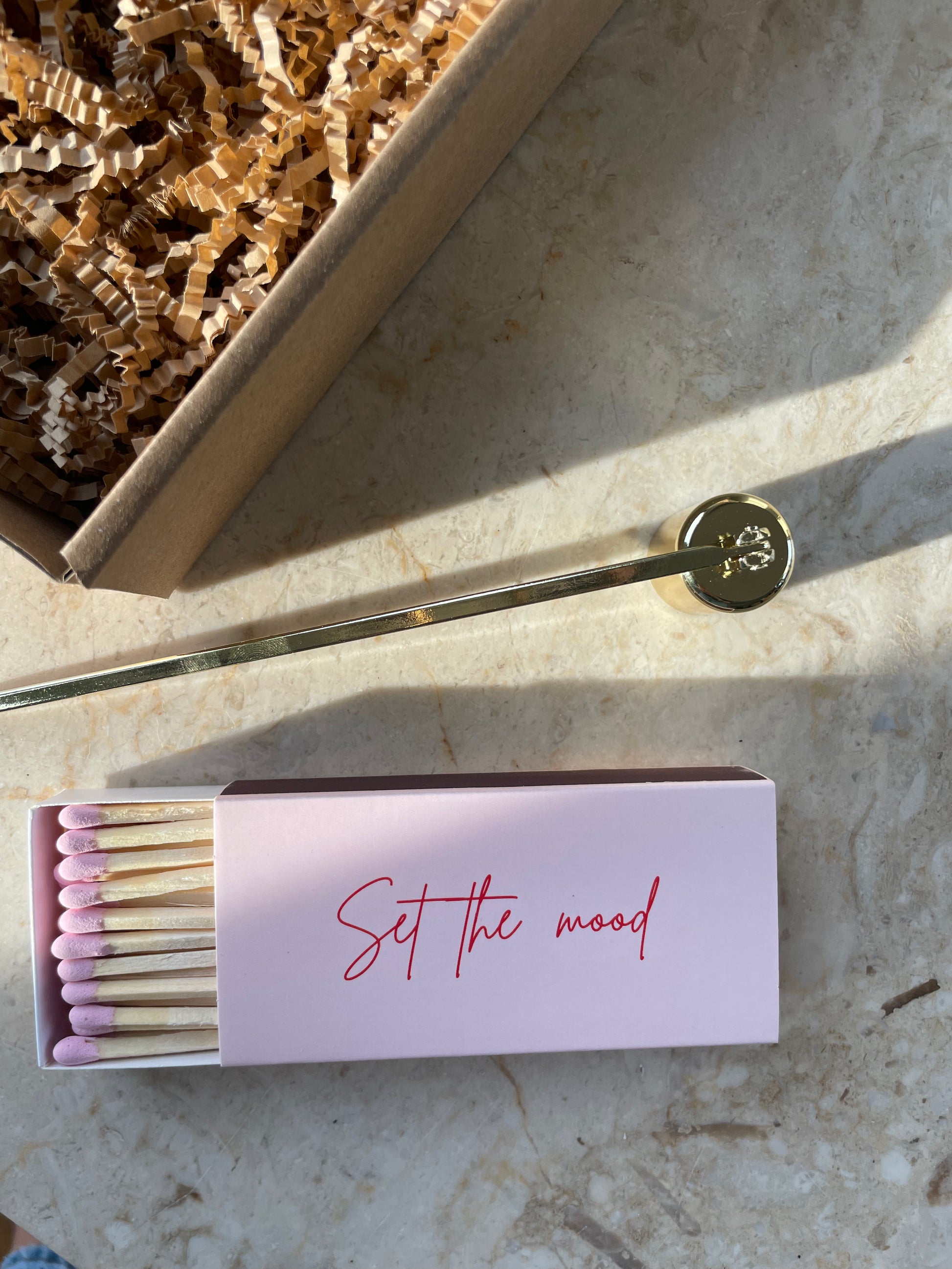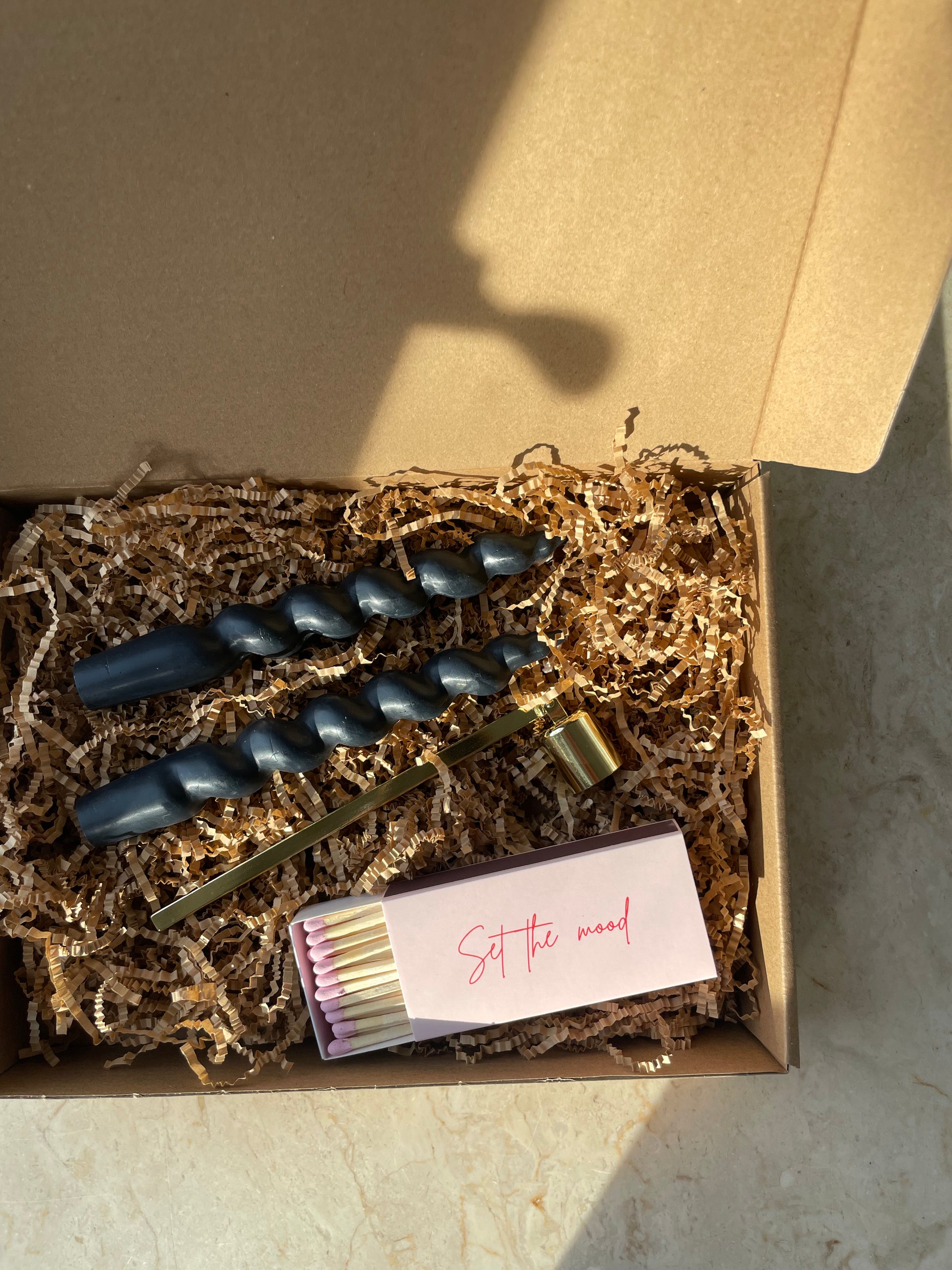 This is a candle gift set that incudes two scented, twisted candles , large matches and a candle snuffer .
