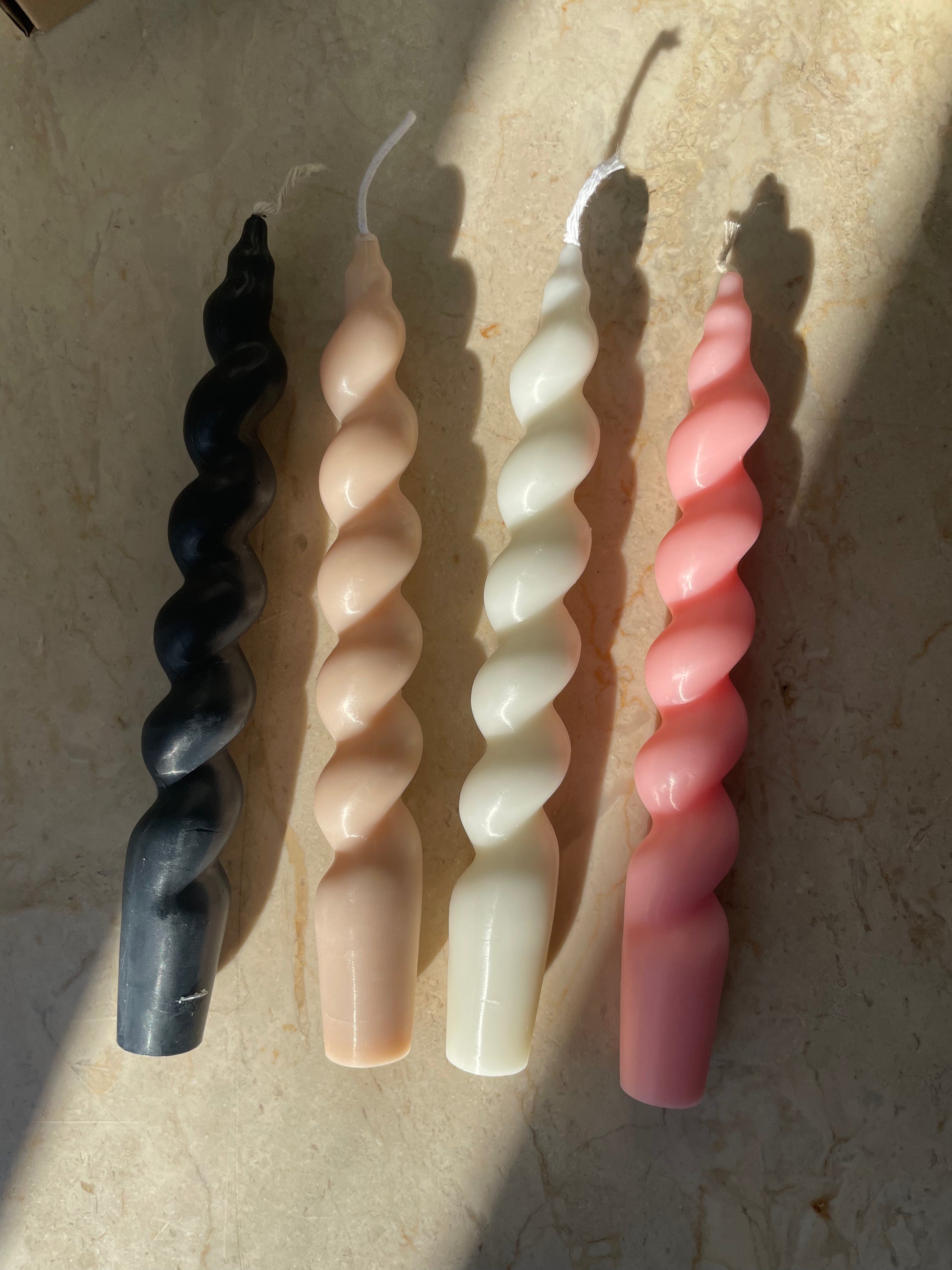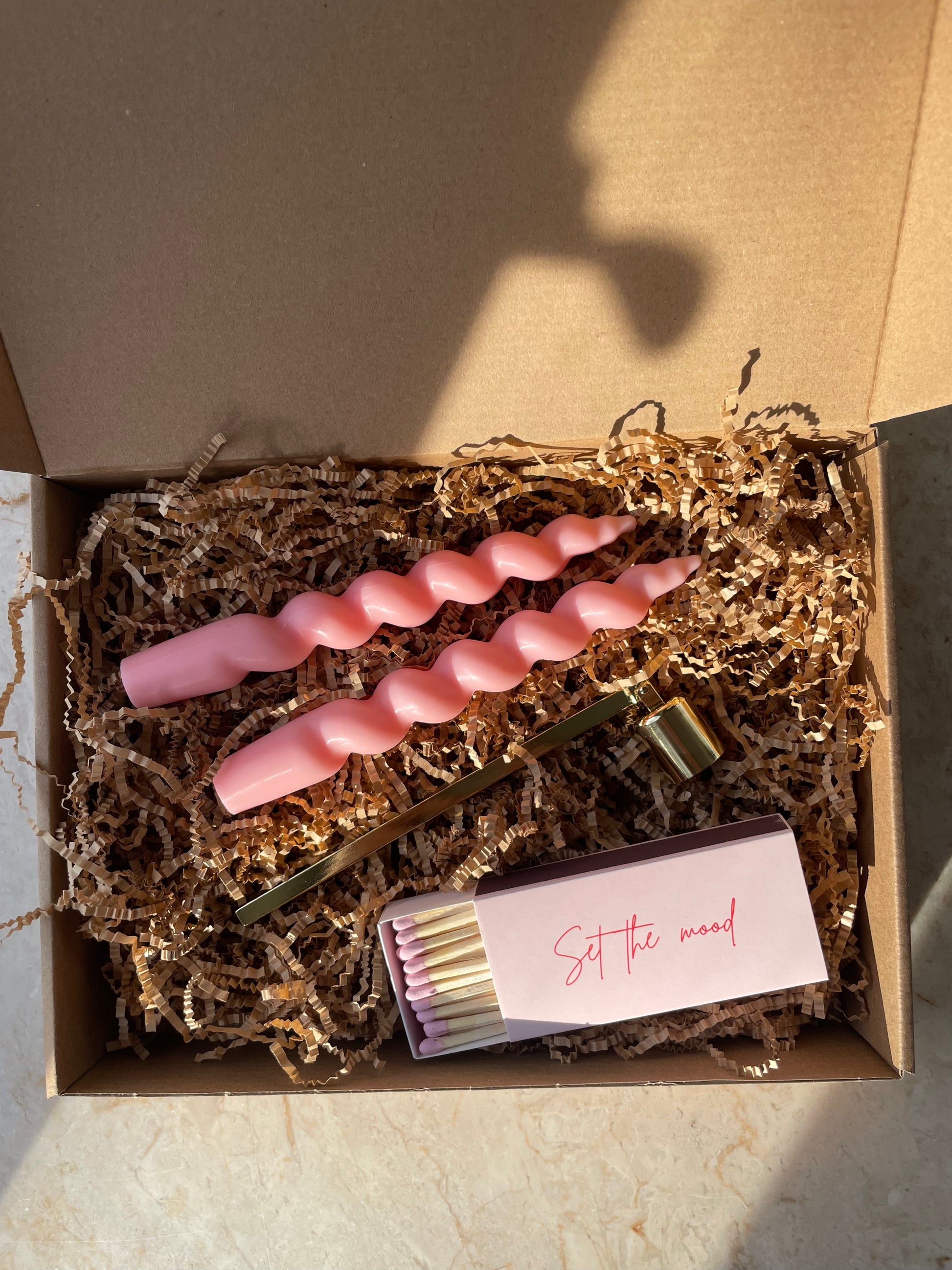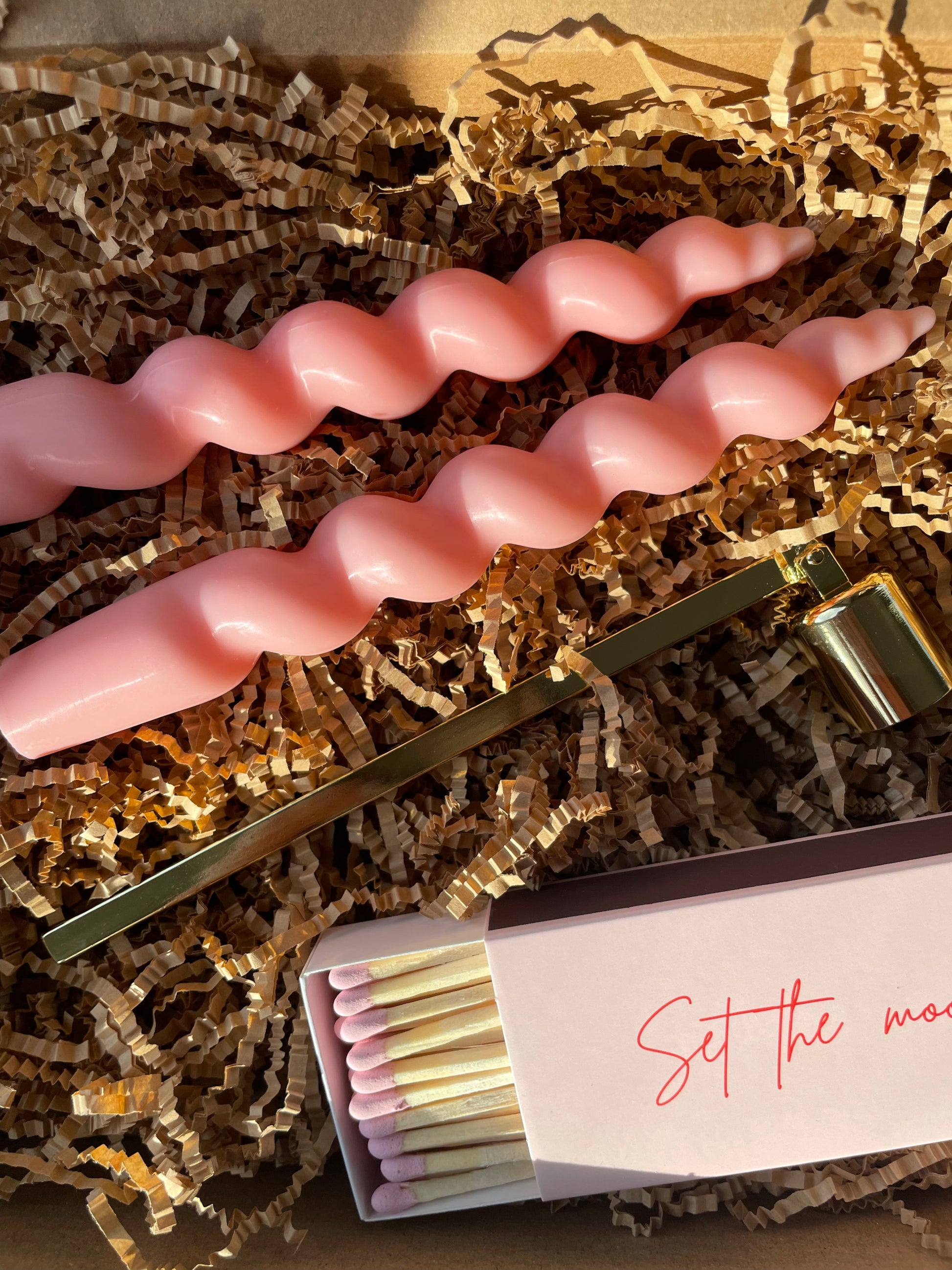 his is a candle gift set that incudes two scented, twisted candles , large matches and a candle snuffer .