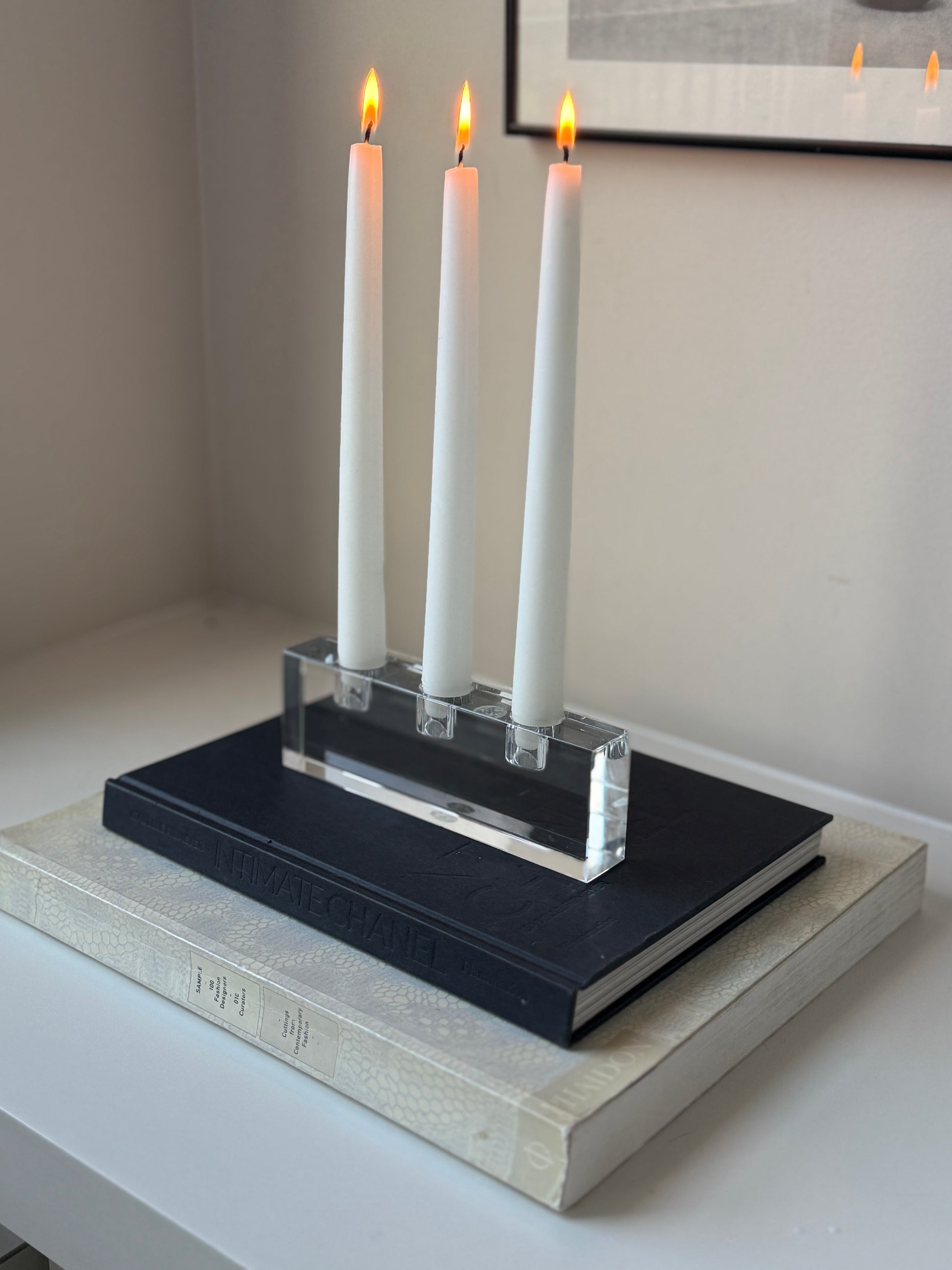 A stunning heavy glass candleholder designed to hold three taper candles. Its clear, sculptural form catches the light beautifully, adding a refined and modern elegance to any space. Perfect for coffee table styling, dining tablescapes, or bookshelf accents.