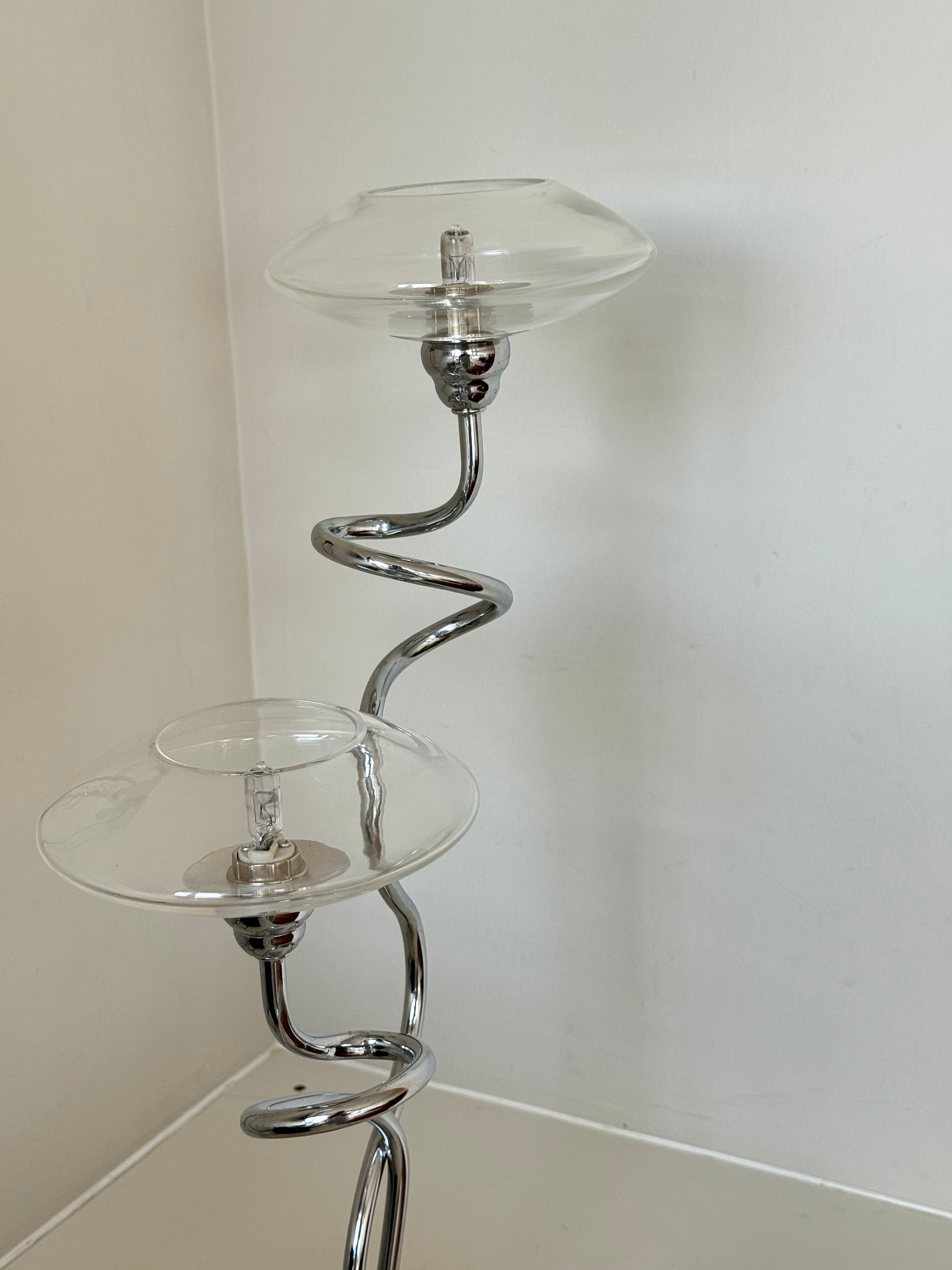 Sculptural chrome table lamp with two floating glass shades