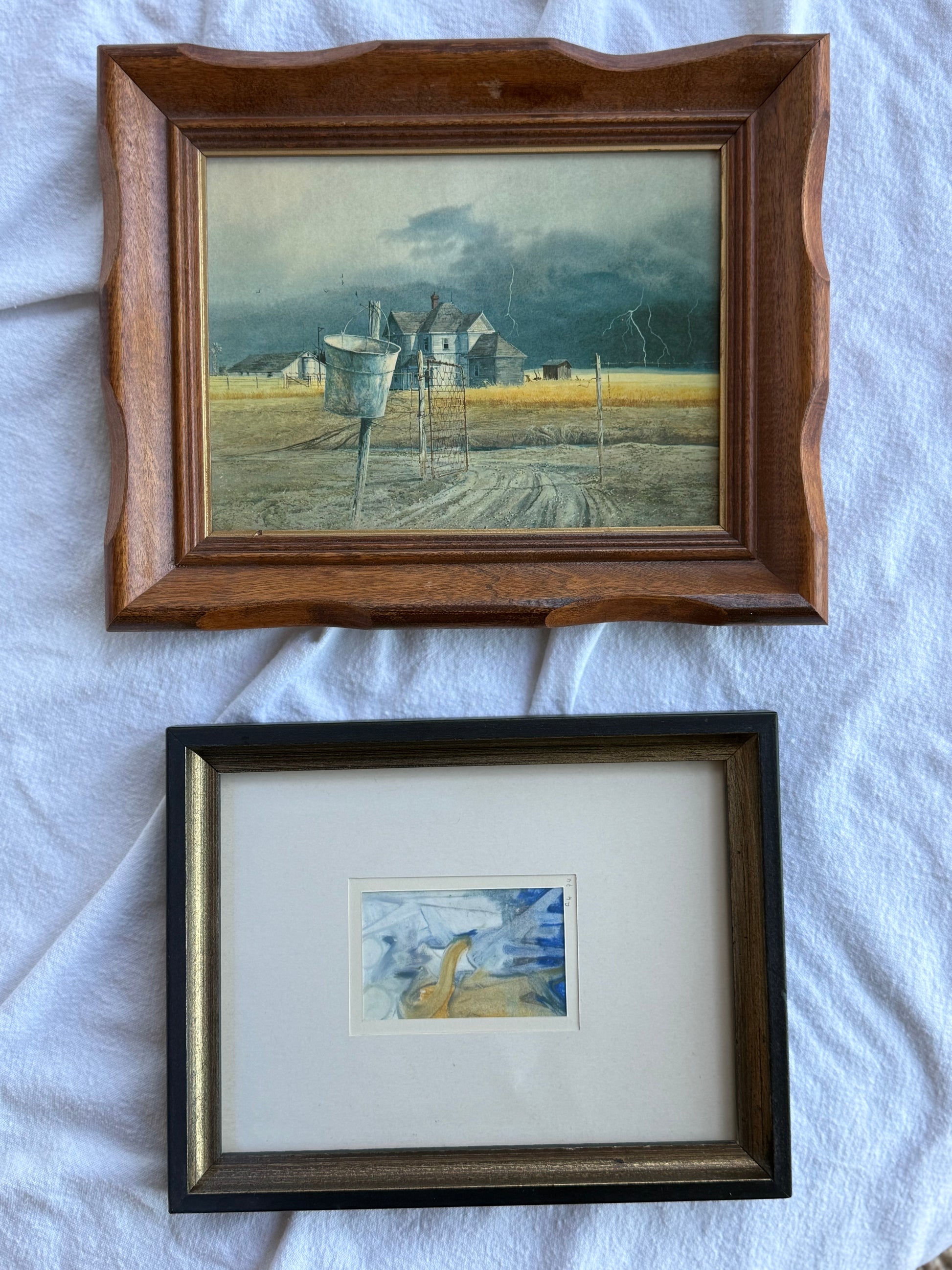 Pair of Vintage Framed Art Prints – Rustic Farm Landscape & Abstract Miniature