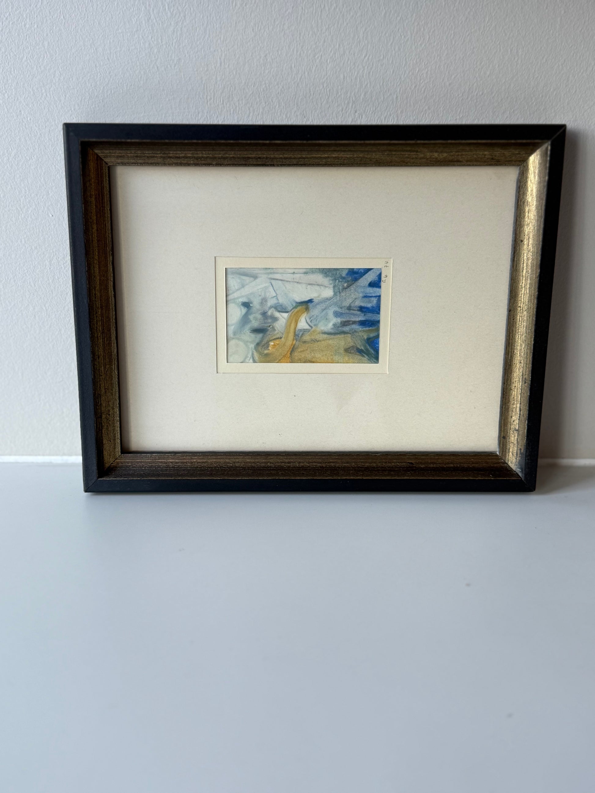 A small abstract miniature in blue and beige tones, framed with a gold-accented border (9” × 7”).