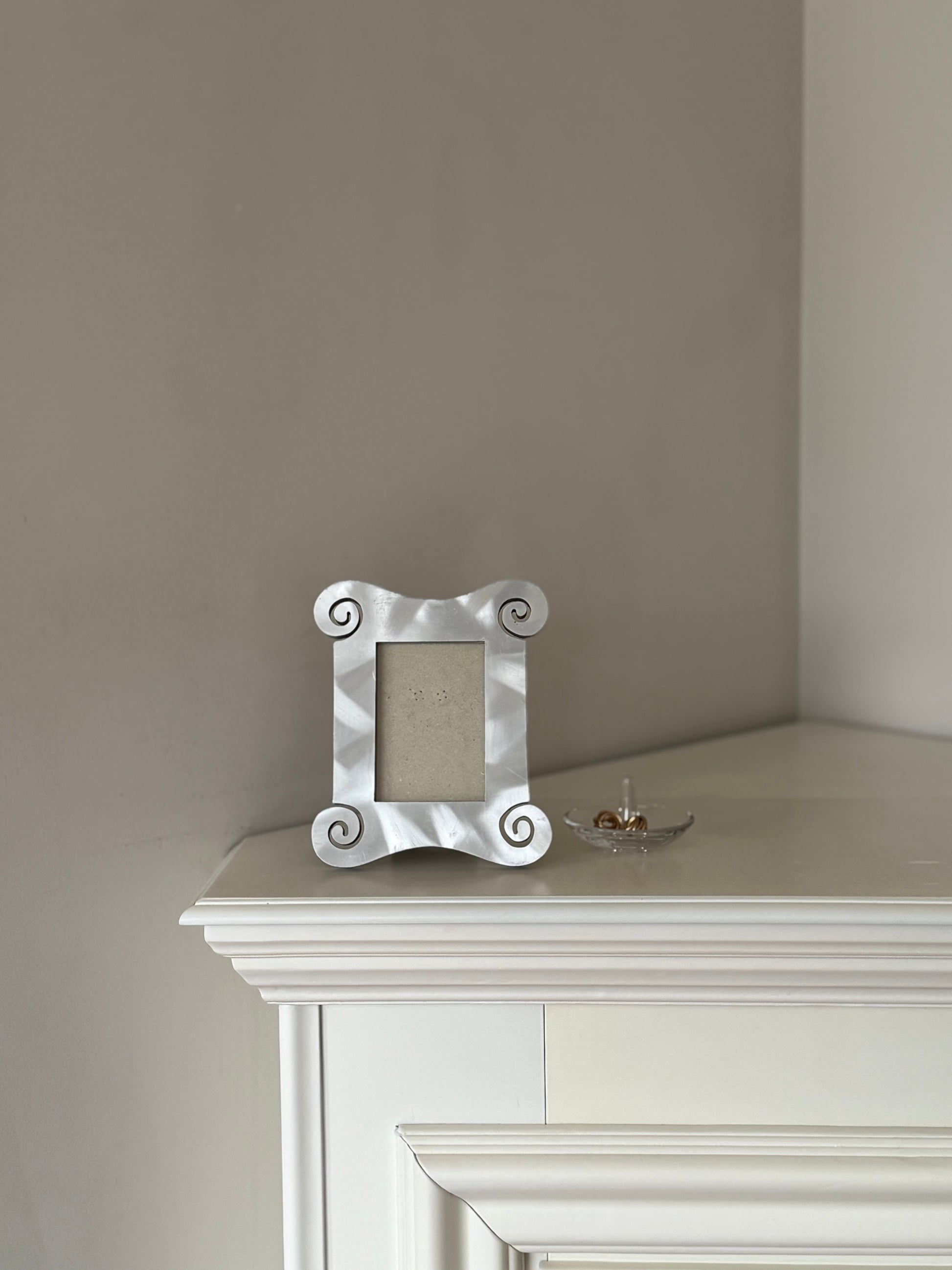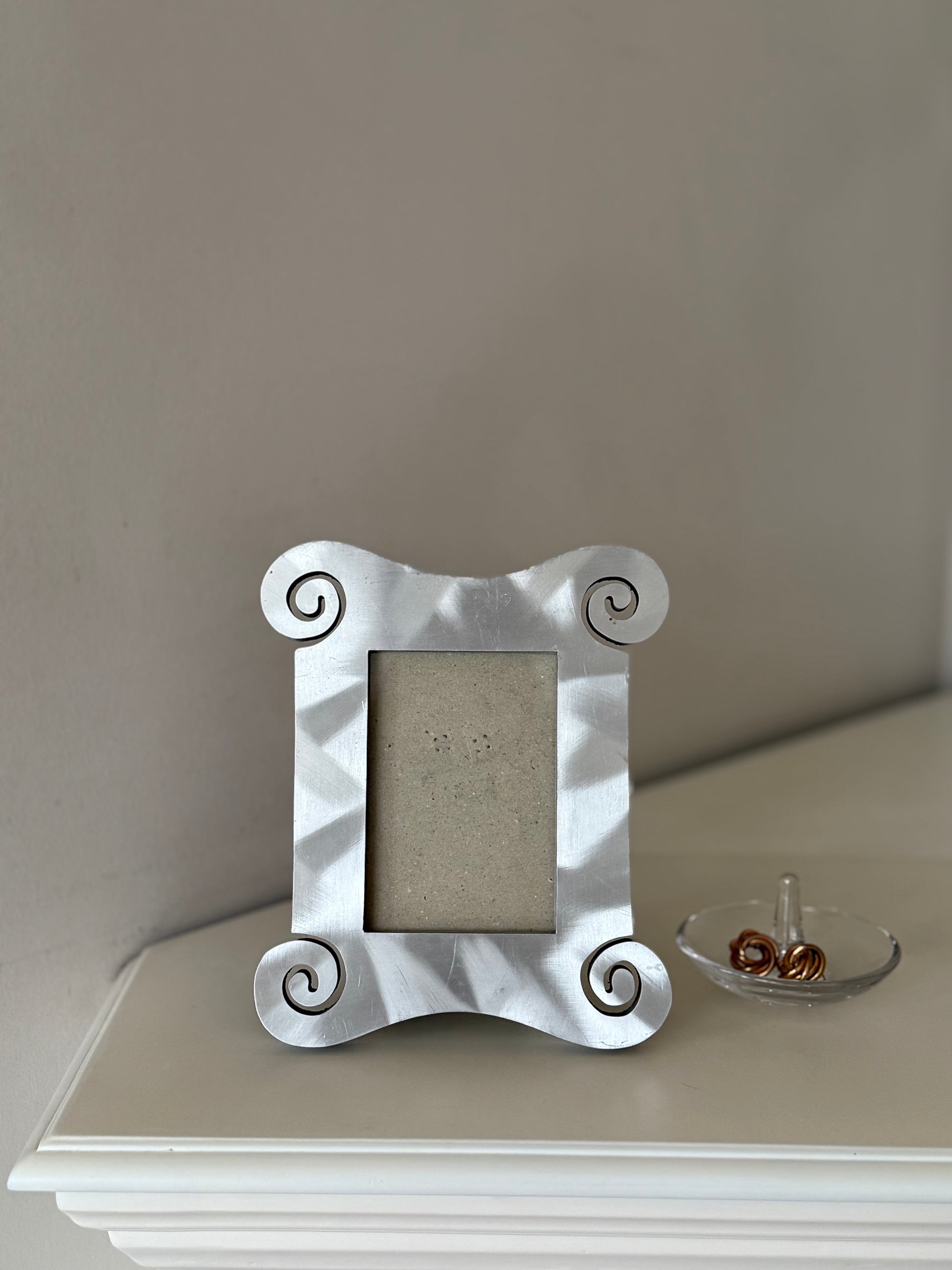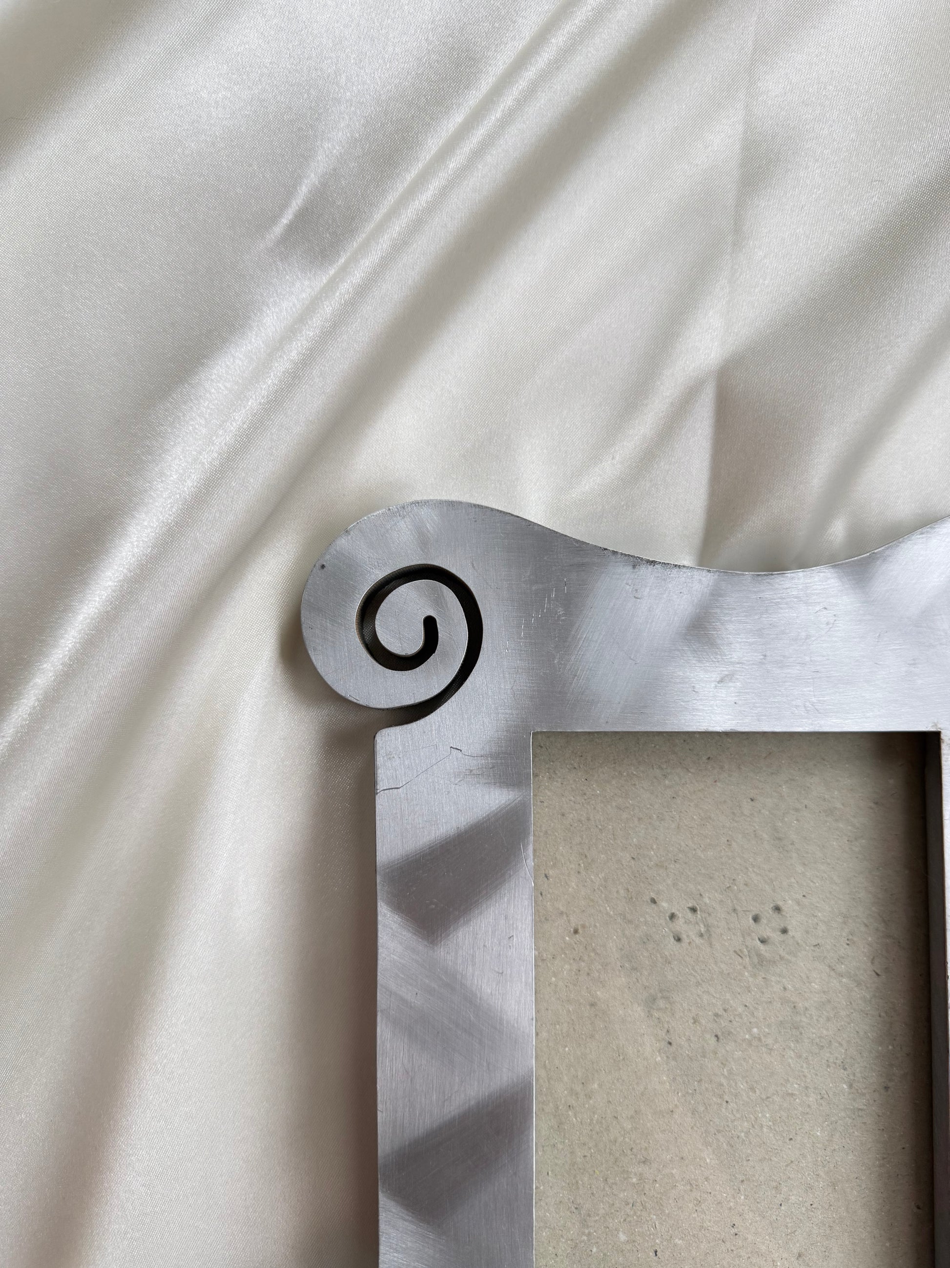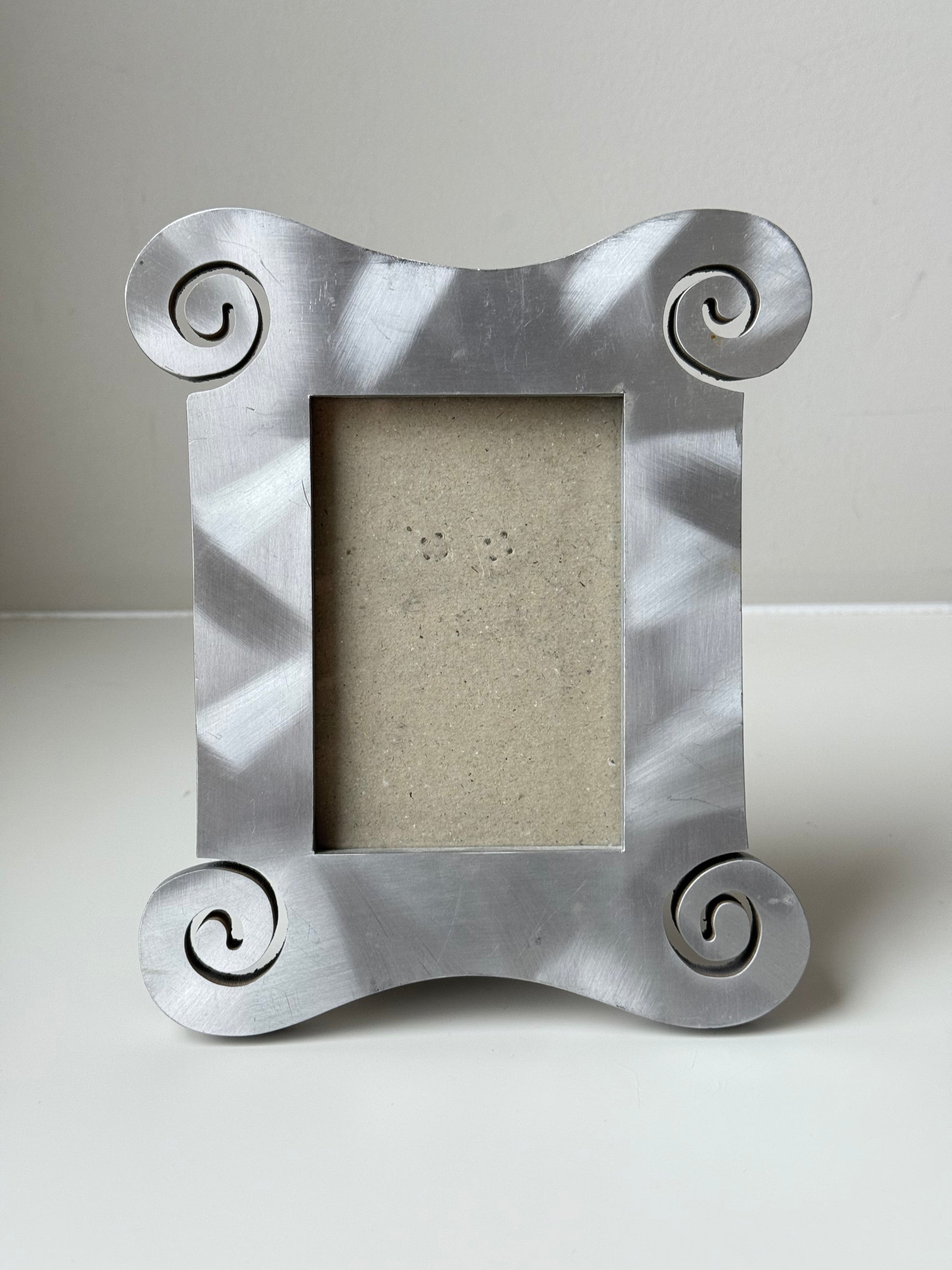 A sculptural decorative photo frame with softly curved edges and subtle scroll details at each corner. The light silver-toned finish gives it a clean, timeless look that works beautifully in both modern and classic interiors.