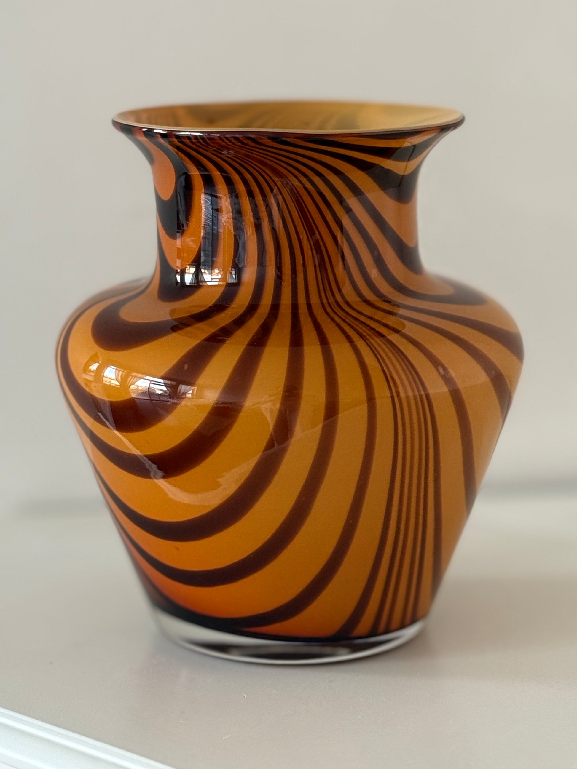 Striking vintage art glass vase featuring a rich amber base with flowing dark brown swirl patterns.
