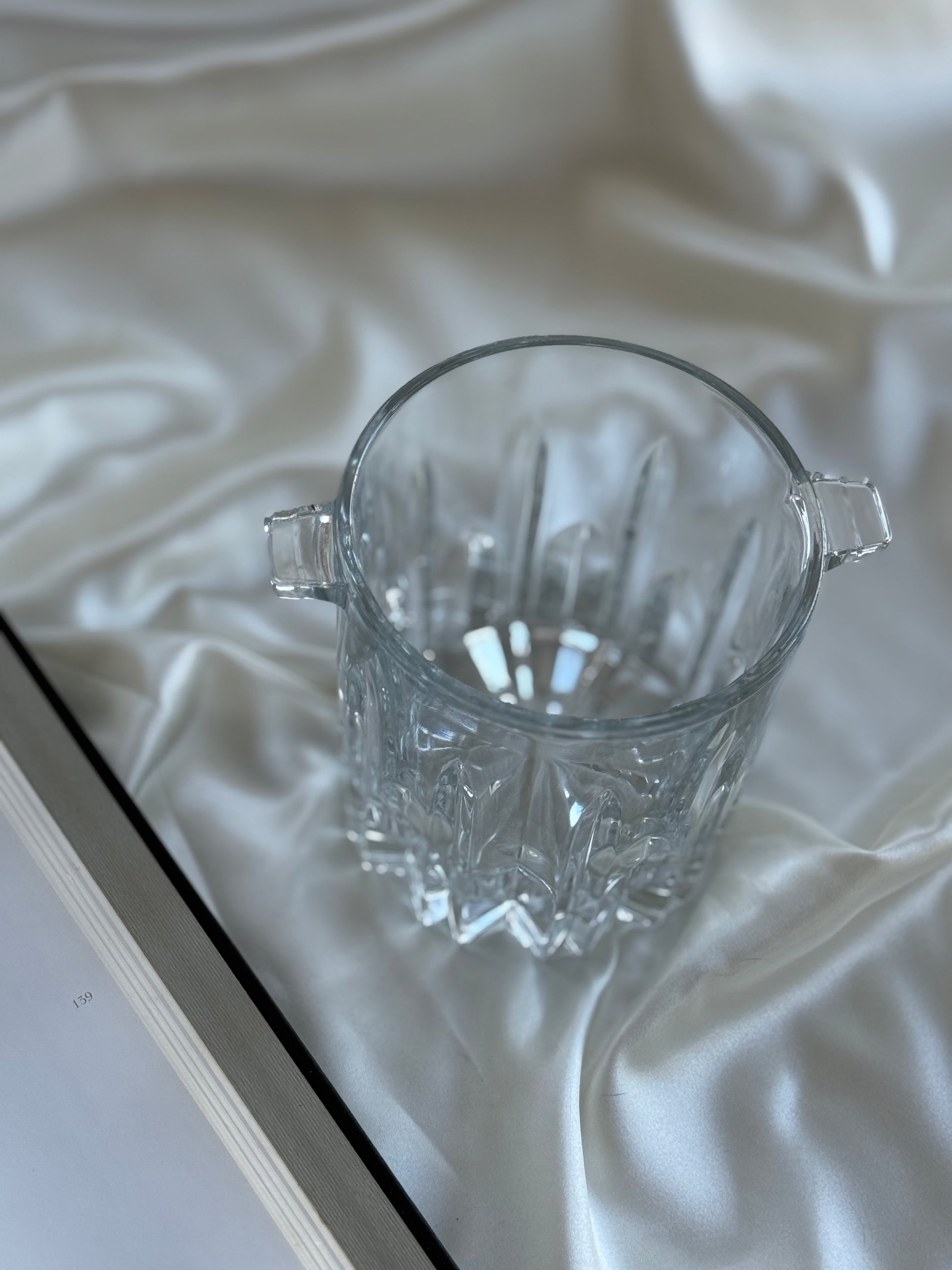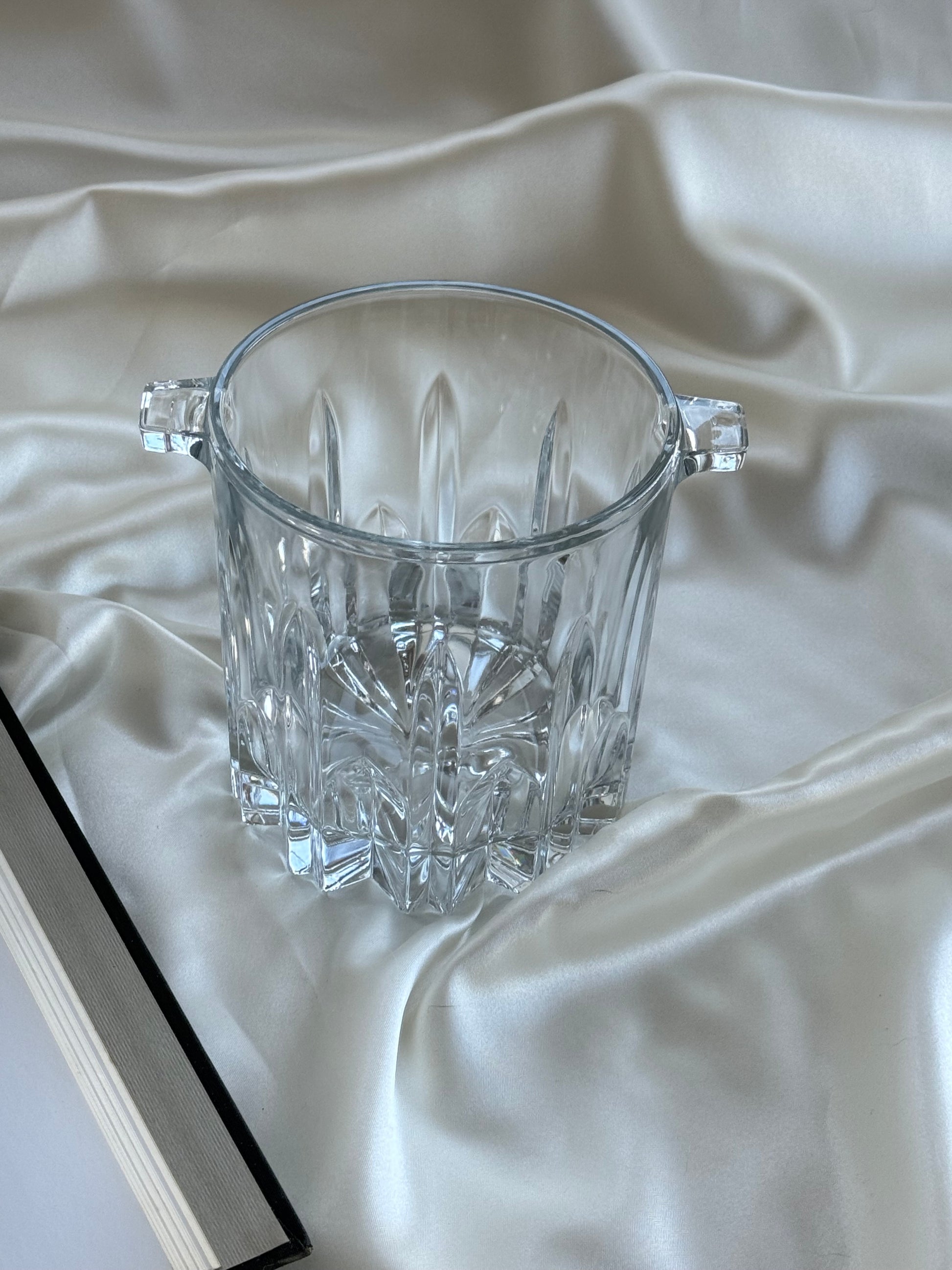 Elegant Italian crystal ice holder crafted from clear, heavy crystal with sharp vertical cuts and a faceted base that catches the light beautifully. Features two integrated side handles and a timeless, classic silhouette.