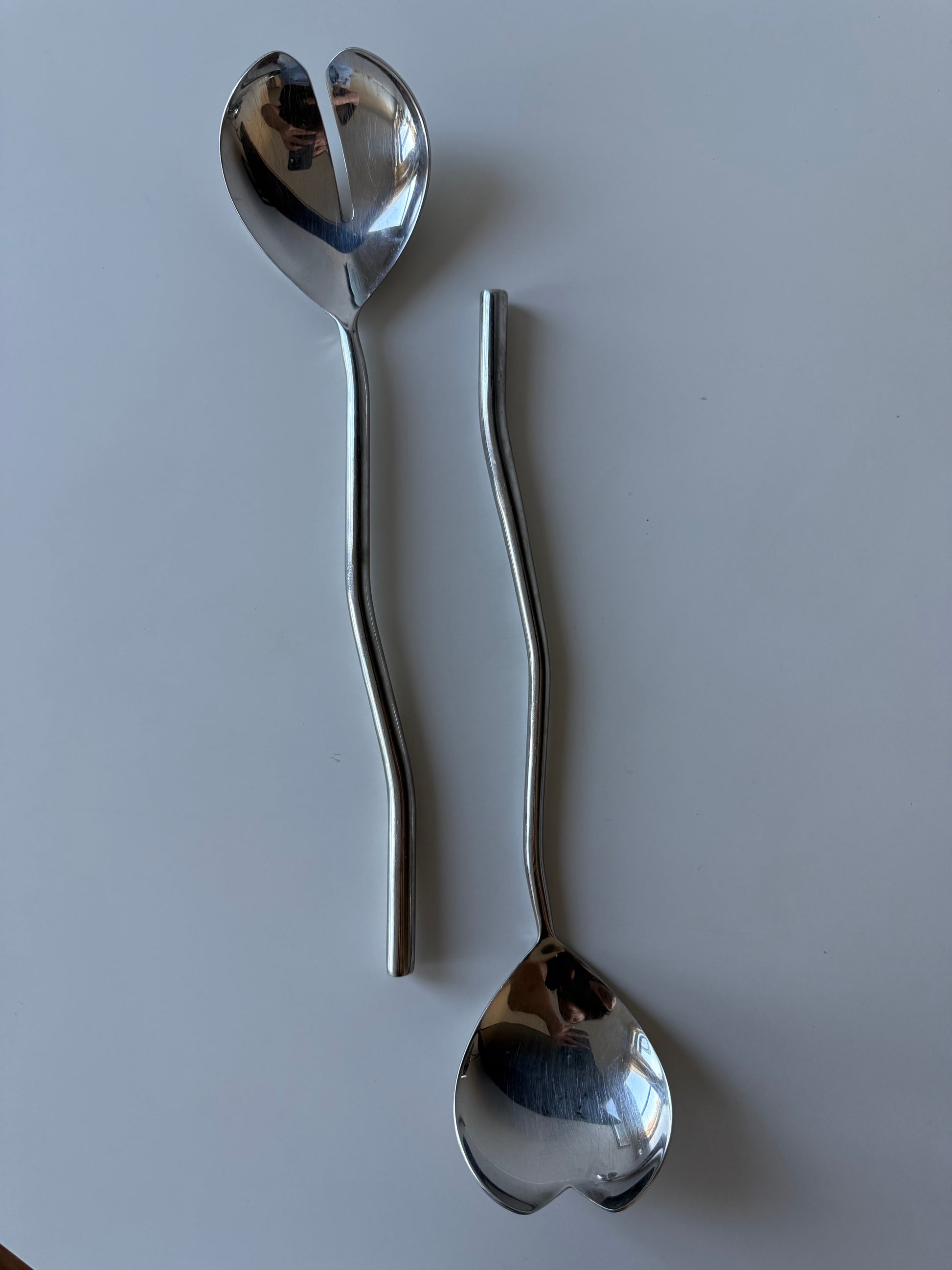 Sculptural vintage salad servers crafted from polished stainless steel, featuring heart-shaped heads and gently curved handles — a perfect example of mid-century Scandinavian-inspired design.