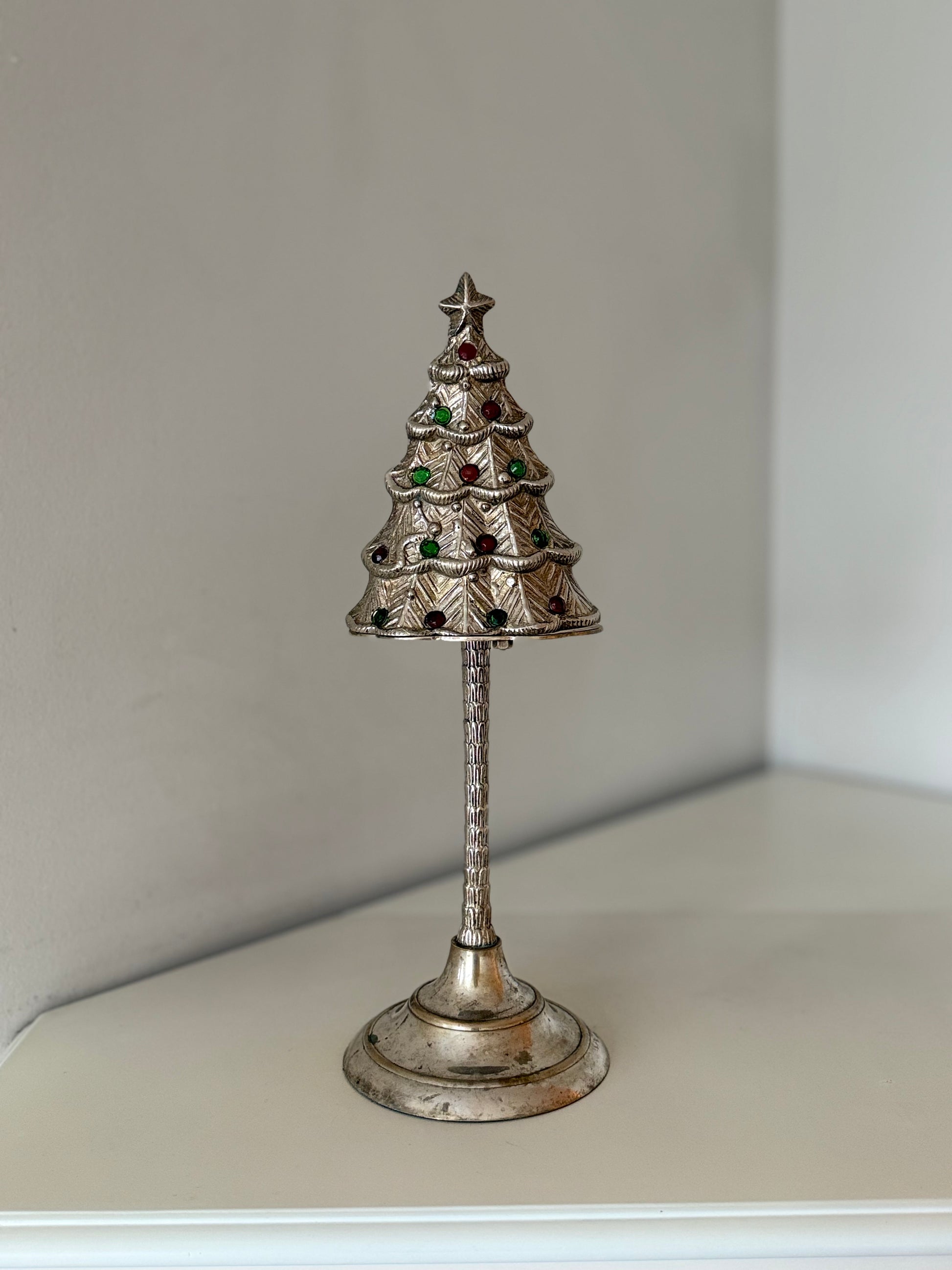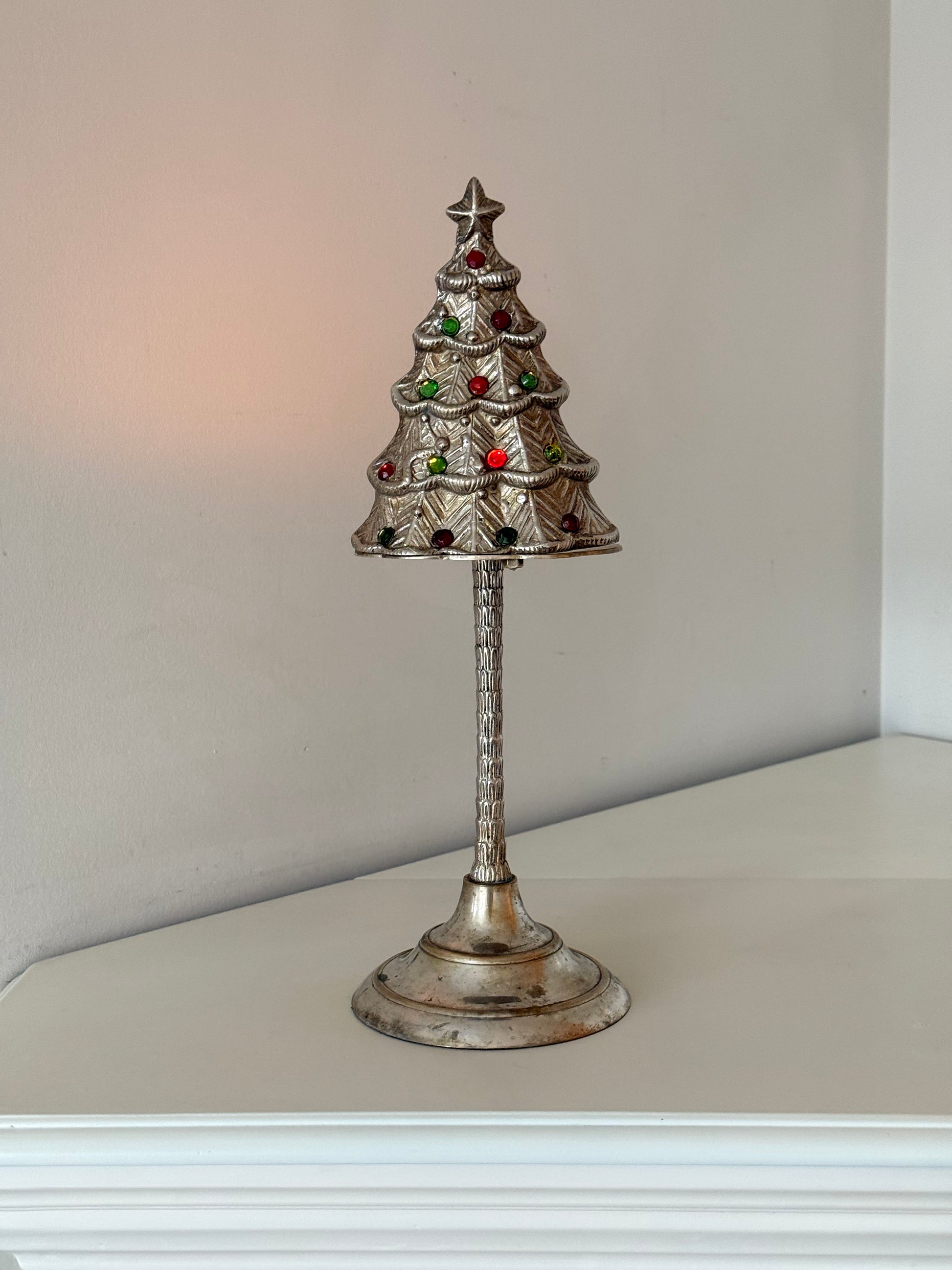 A beautifully crafted vintage silver-plated candleholder shaped as a stylized Christmas tree, adorned with red and green glass accents that catch the light with subtle festive charm. This piece has a lovely weight to it — solid, heavy, and made to last — giving it a substantial, high-quality feel.