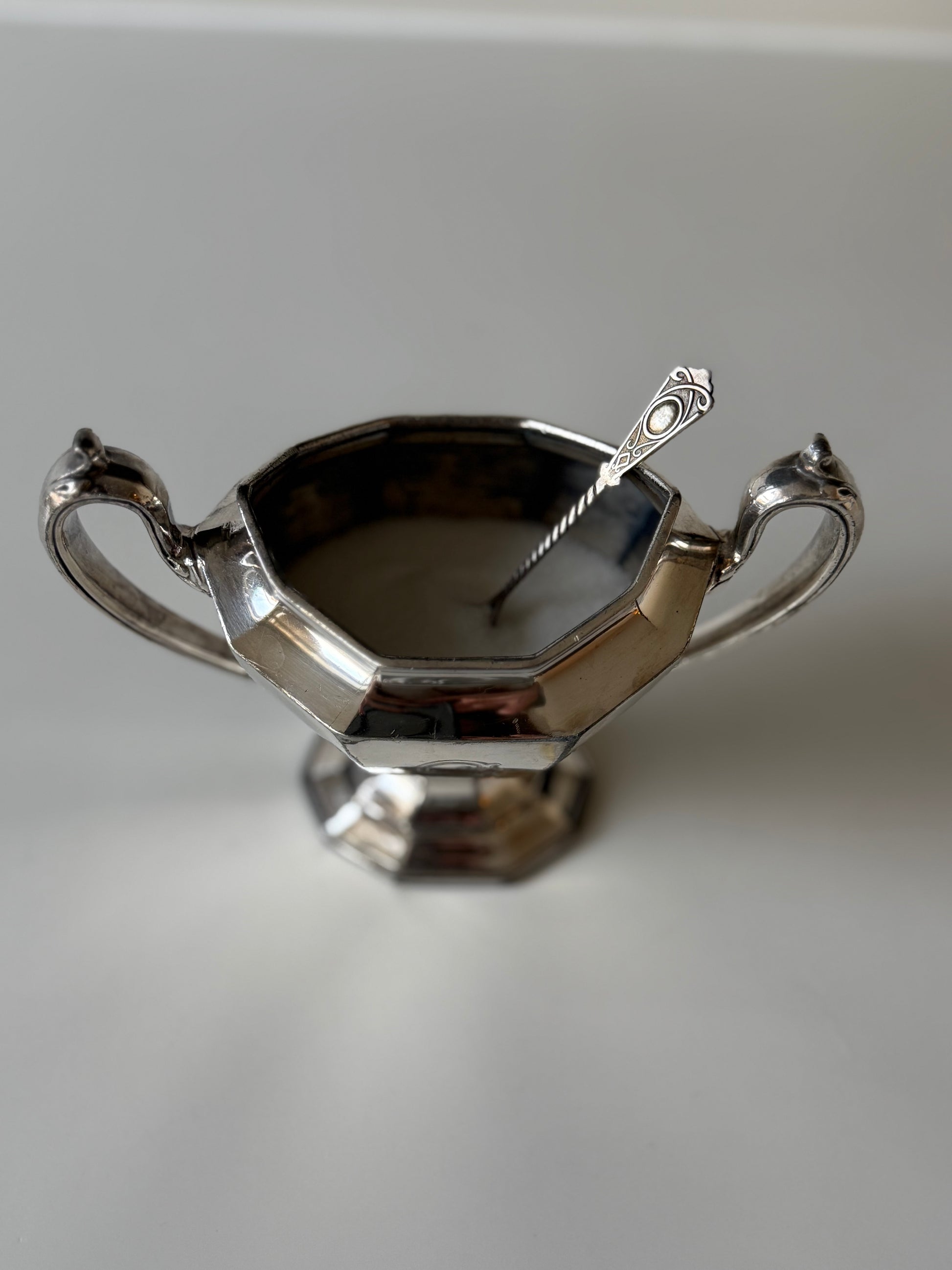 Features a beautiful double-handle design with subtle Art Deco lines and a matching ornate spoon.