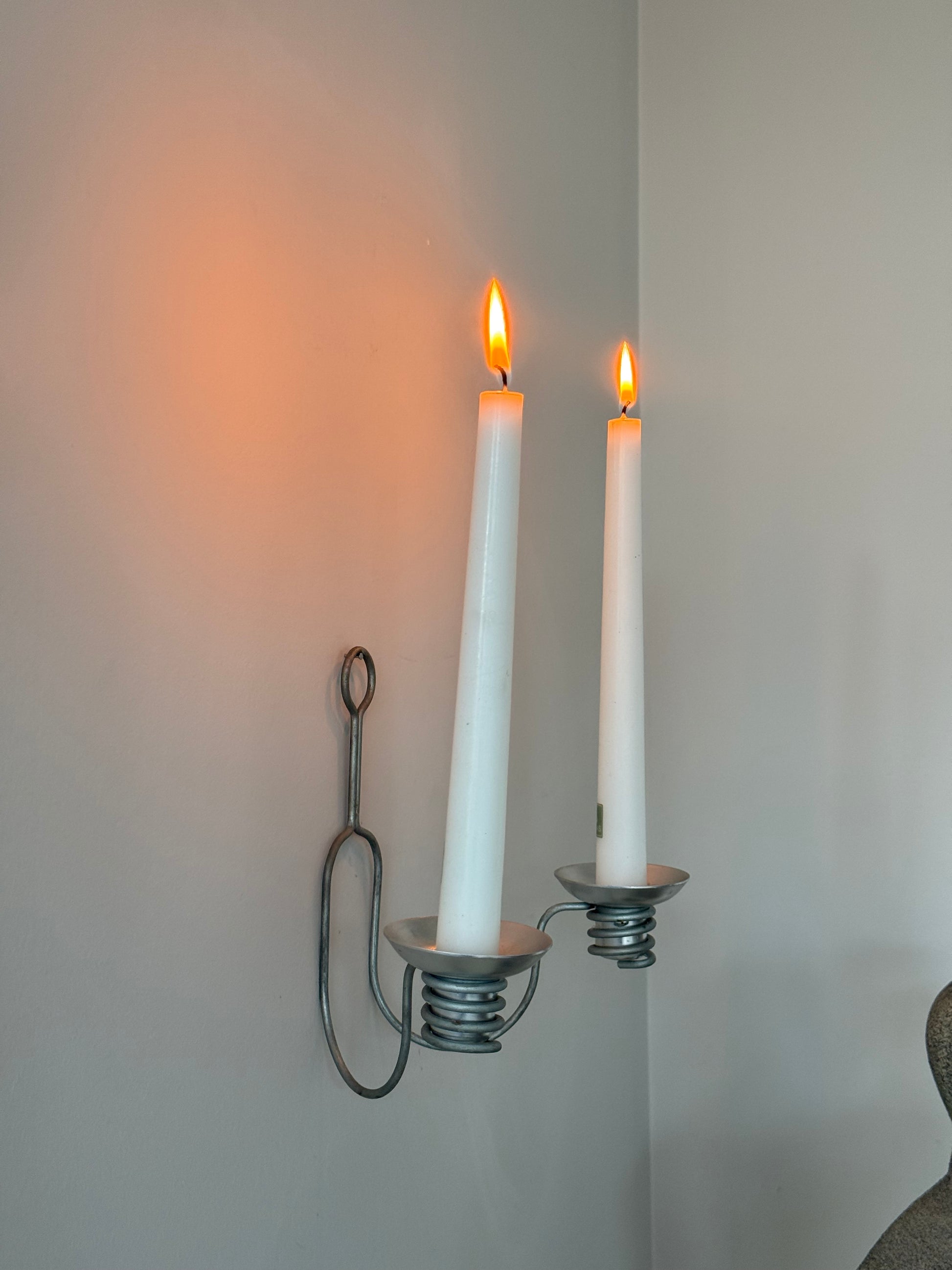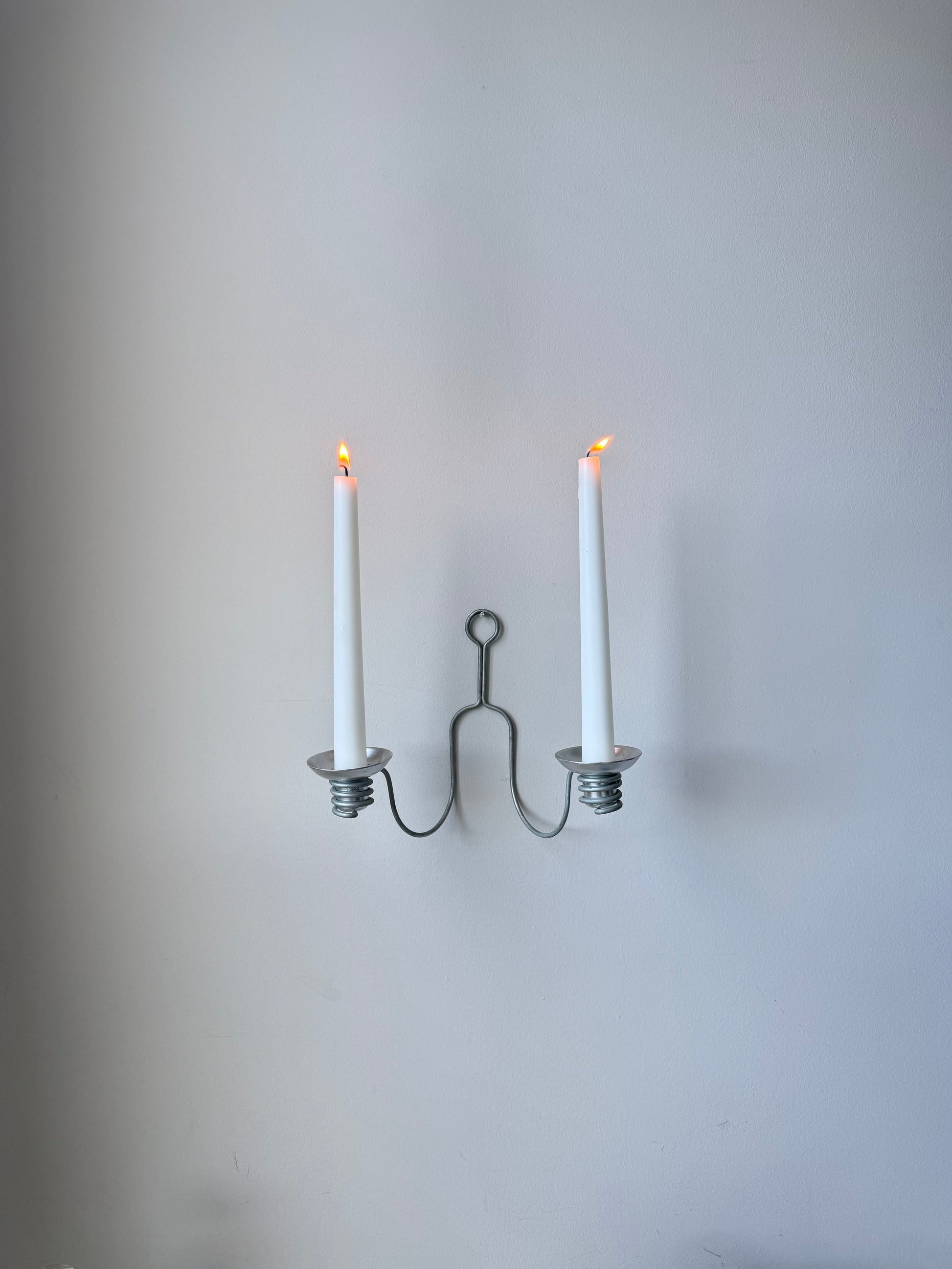 Minimalist vintage wall-mounted candle sconce with a sculptural double-arm form. Crafted from metal with a softly aged, matte silver/grey finish, it features two candle cups designed for classic taper candles.