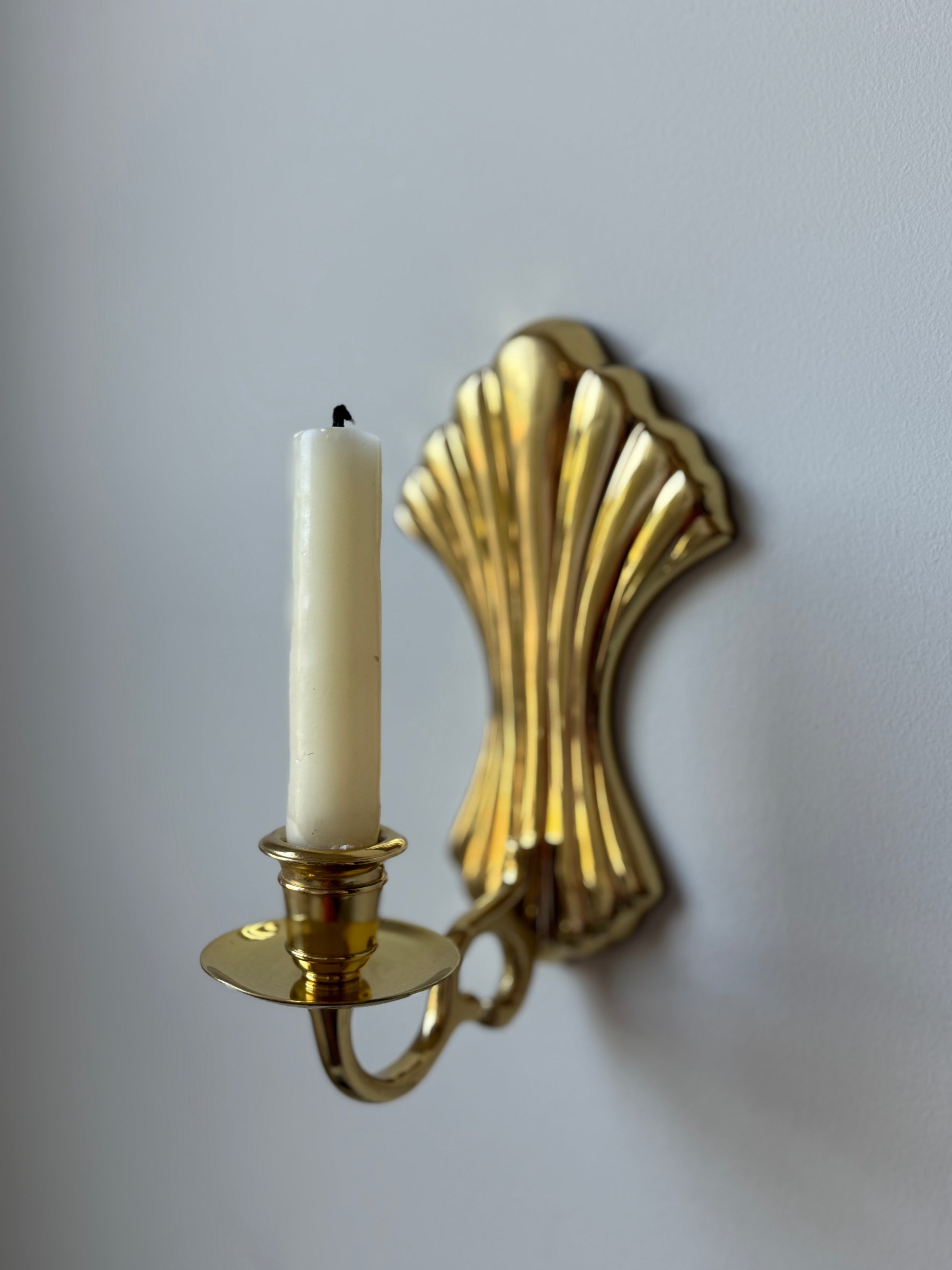 Elegant wall-mounted brass candle sconce featuring a striking scallop shell backplate and curved arm. With its polished golden finish, this piece adds timeless sophistication and a warm glow to any space. Perfect for creating ambiance in hallways, dining rooms, or beside a fireplace.