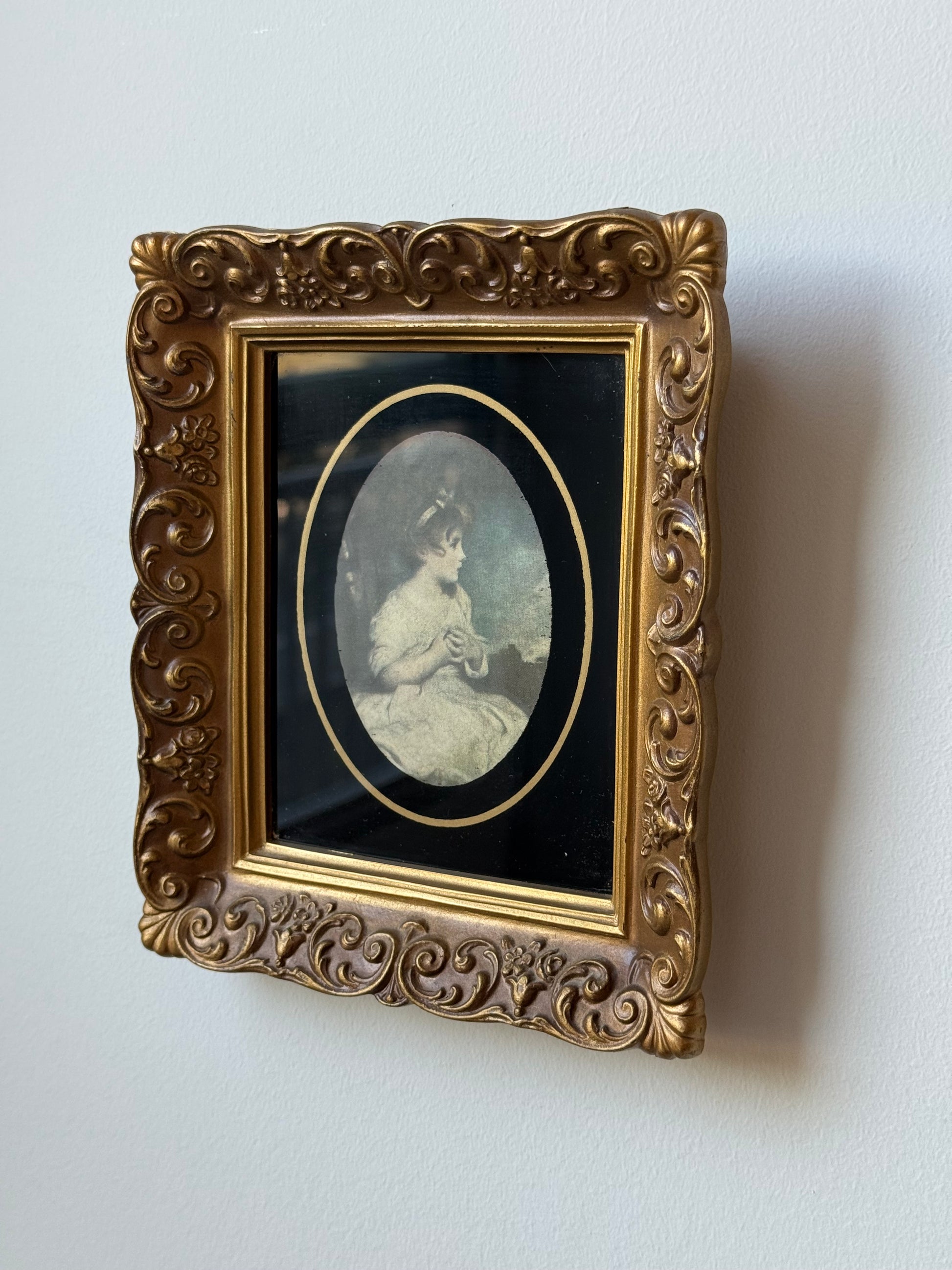 Charming small wall art featuring a delicate portrait of a young woman, housed in an ornate gold-painted frame with intricate floral and scroll details. The back retains its original paper and Made in U.S.A. mark, highlighting its vintage authenticity.