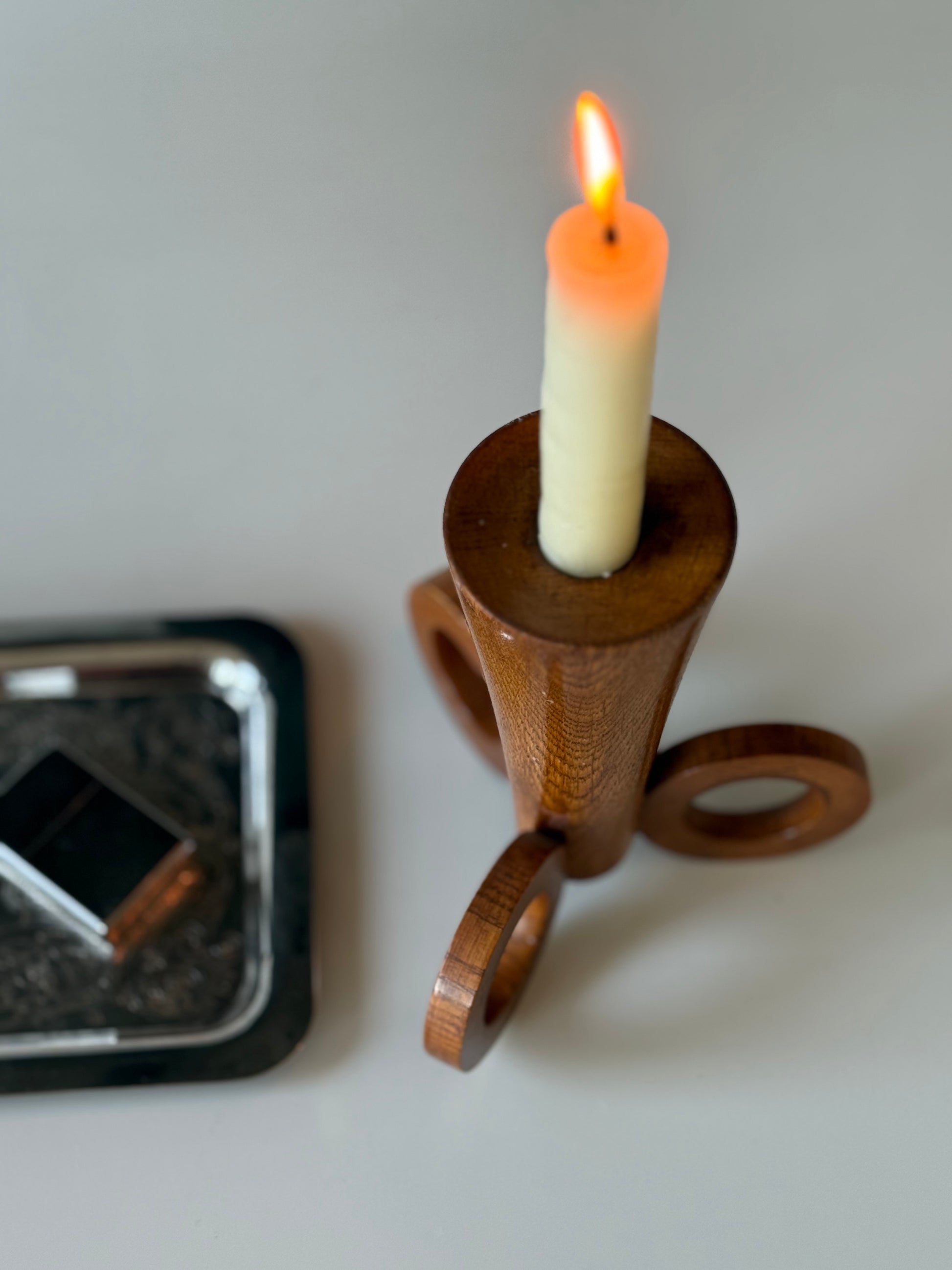 Sculptural wooden candle holder with a warm natural finish and a striking design. The tapered body sits on three circular ring feet, giving it an architectural mid-century look with playful detailing. A unique statement piece that balances form and function.