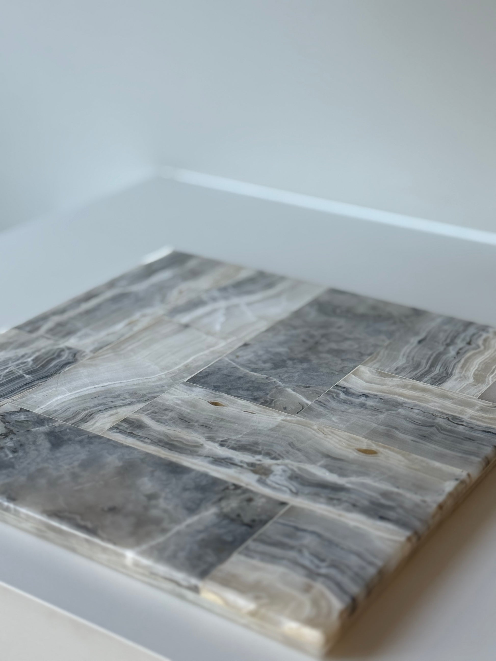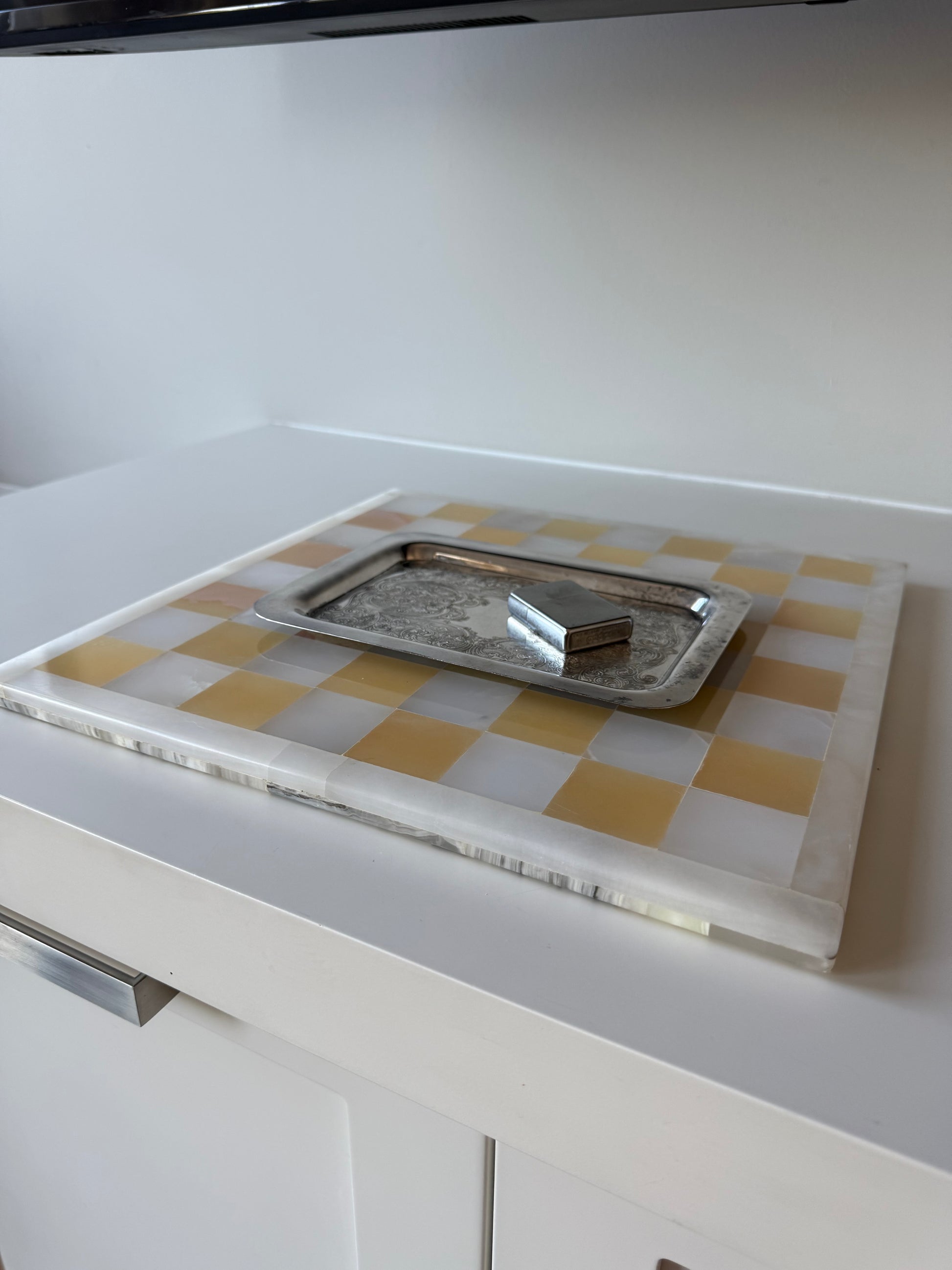 Beautiful handcrafted stone checkerboard featuring natural onyx in warm cream and honey tones on one side, and striking gray marbled stone on the reverse. Its polished surface highlights the unique veining of the stone, making it both a functional game board and a decorative statement piece.
