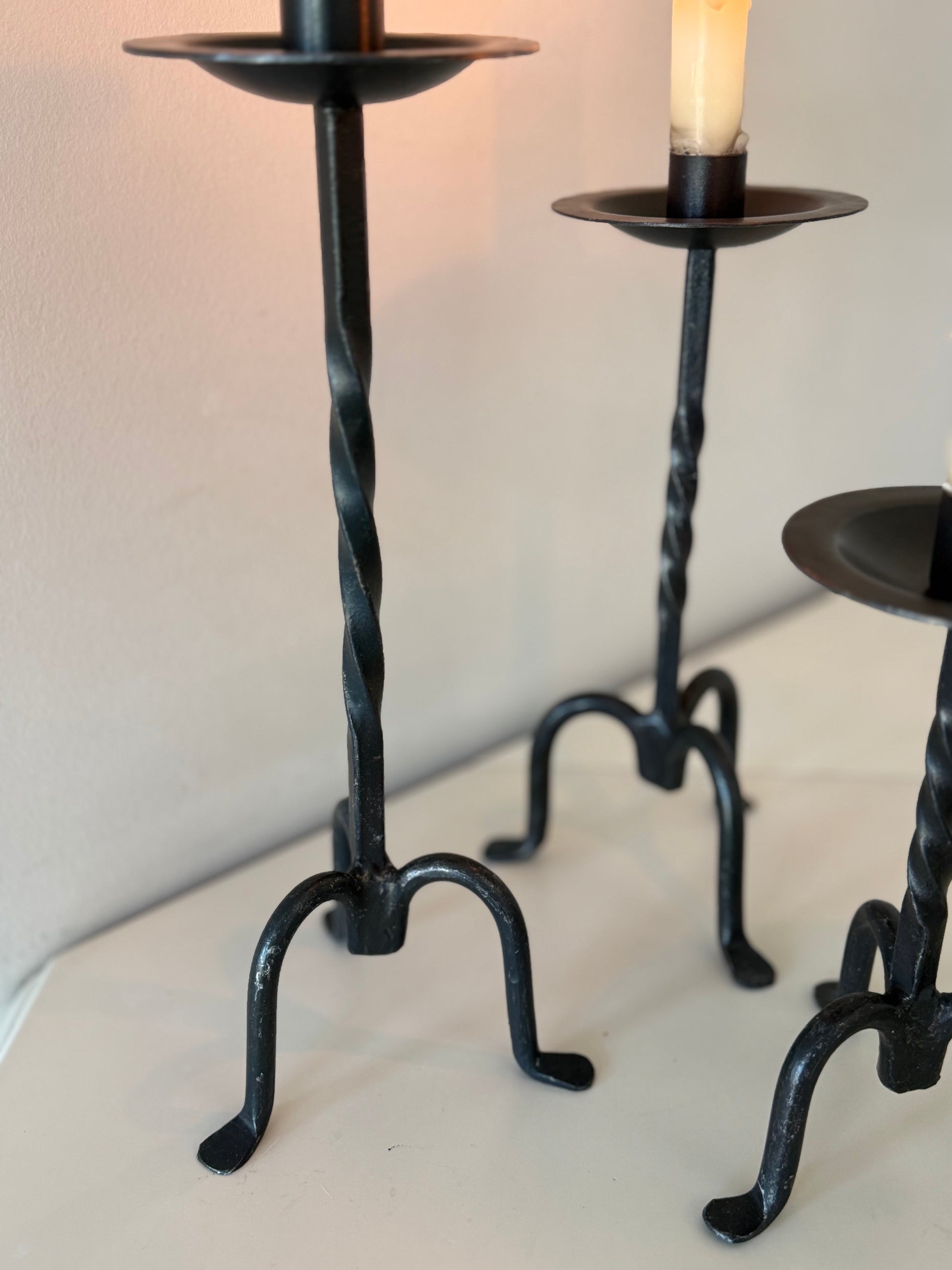 Bring timeless charm and a touch of old-world craftsmanship into your home with this set of three wrought iron candlestick holders. Featuring hand-forged twisted stems and sturdy tripod bases, each piece offers rustic elegance with a minimalist silhouette.