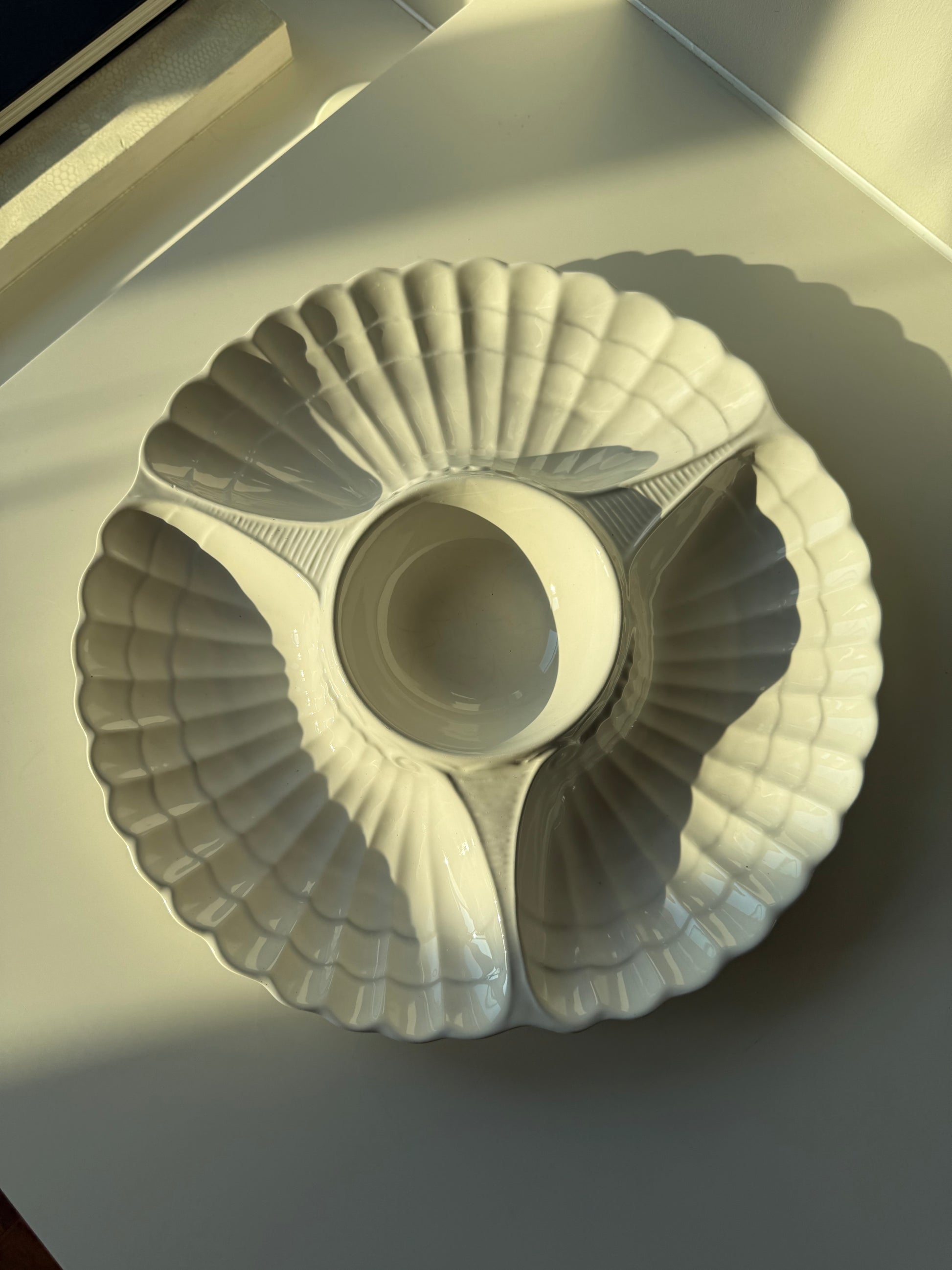 A charming vintage ceramic serving dish featuring three shell-inspired sections with a round center bowl. Crafted in Japan, this piece combines functionality with timeless design. Perfect for serving appetizers, fruits, or snacks, and equally beautiful as a decorative centerpiece.