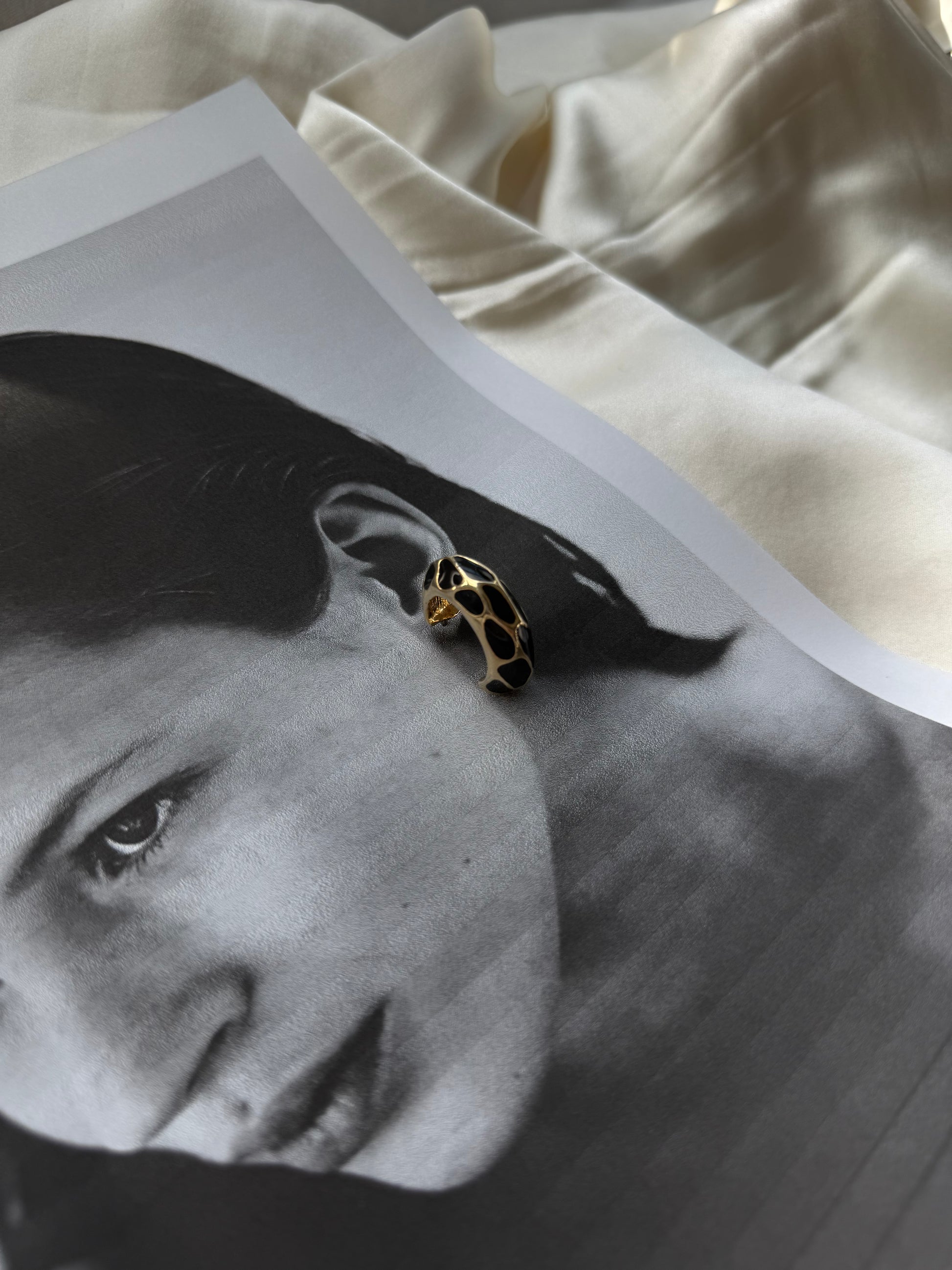 Bold and stylish, these vintage hoop earrings feature a sculptural design in gold-tone metal accented with glossy black enamel. Their chunky silhouette and eye-catching pattern make them a true statement piece.