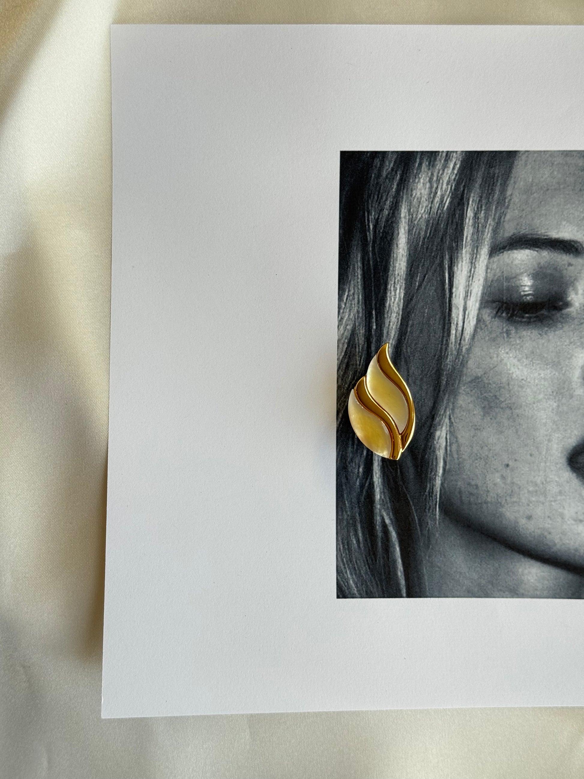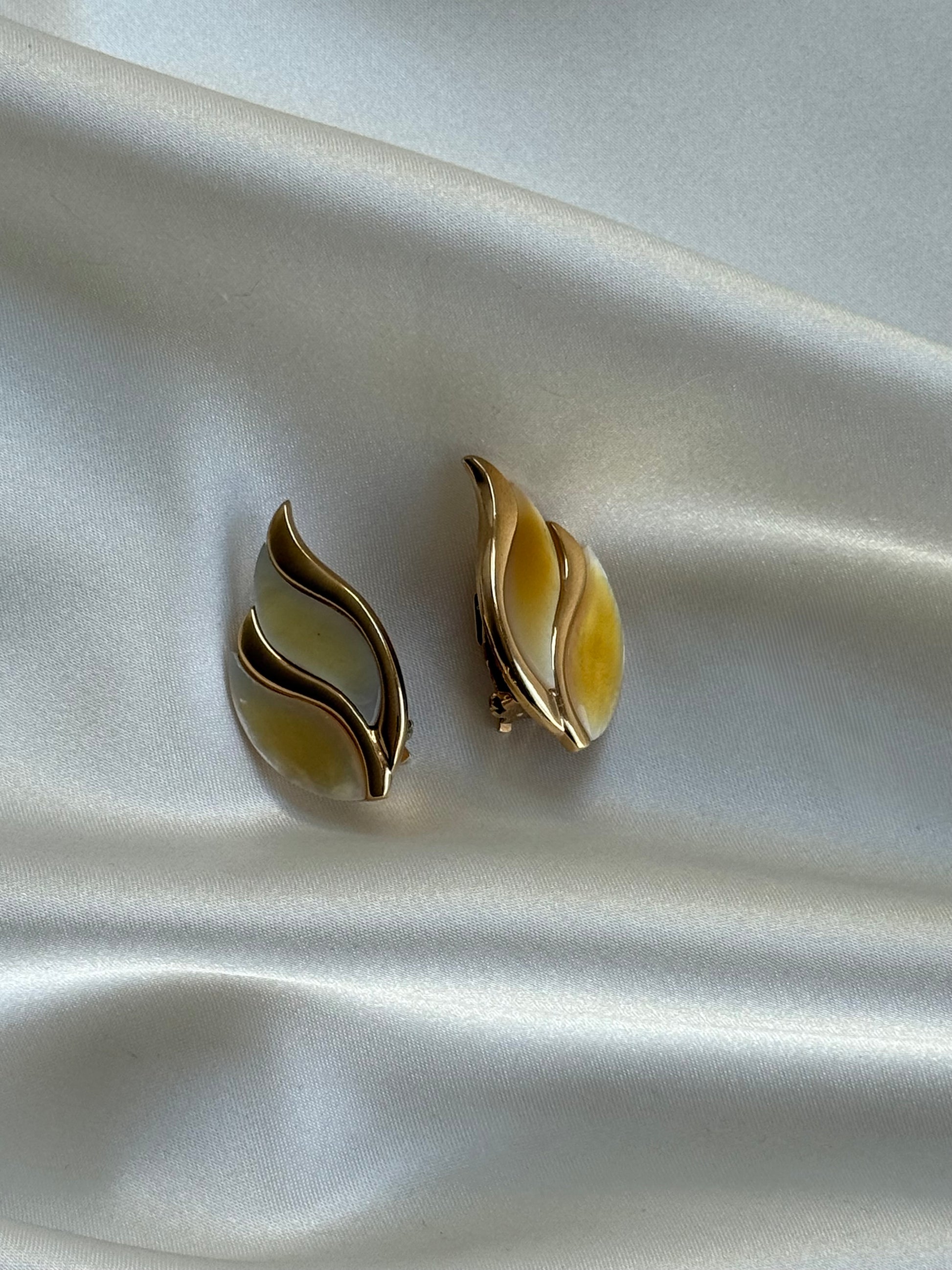 Elegant vintage clip-on earrings featuring a softly curved, layered design in warm gold-tone metal with luminous mother-of-pearl inlays. The organic, flame-like silhouette gives these earrings a graceful, sculptural presence while the natural iridescence adds subtle movement and light reflection.