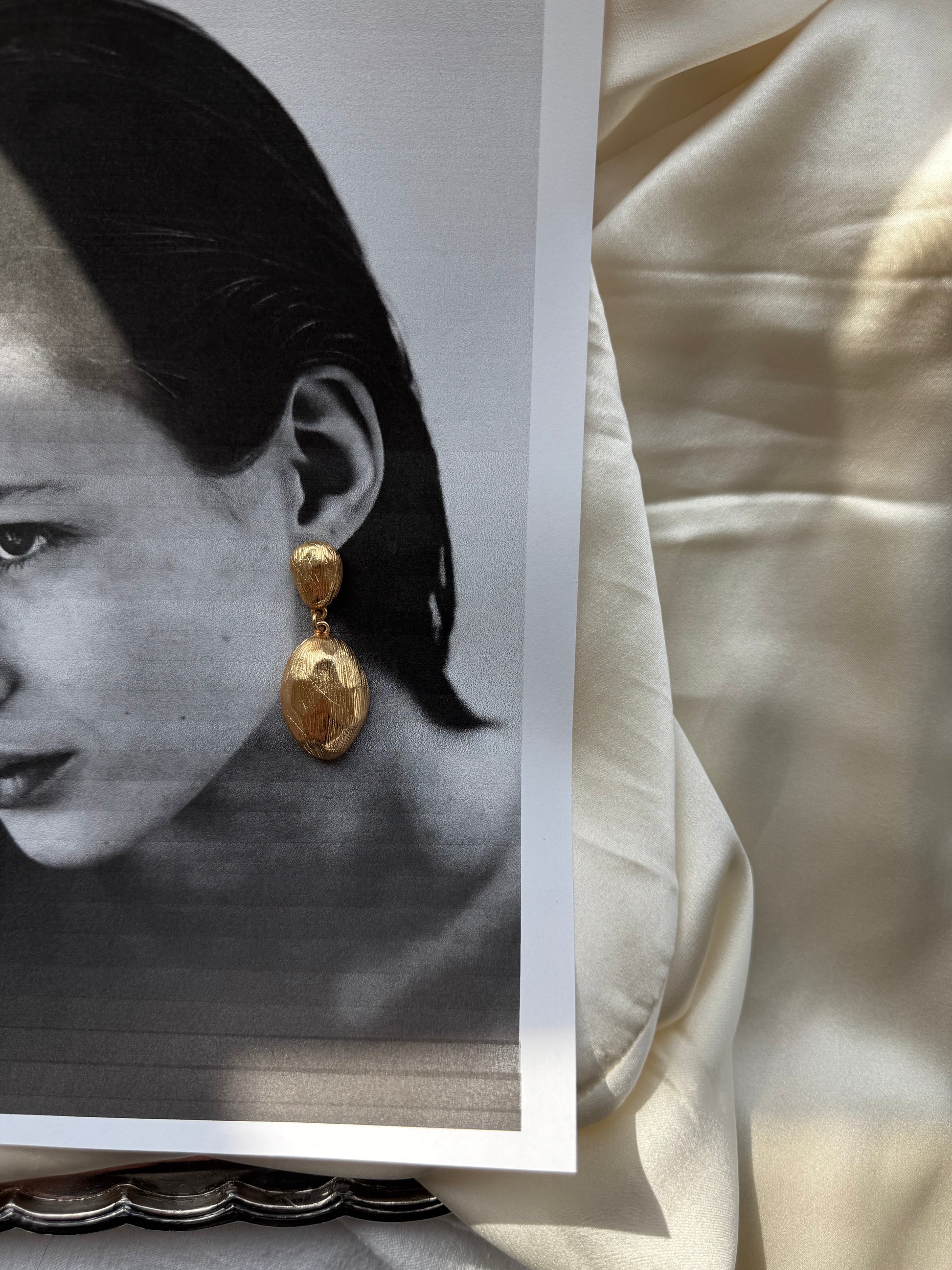 Statement vintage earrings featuring a sculptural oval drop design with a brushed gold tone finish. The textured surface catches the light beautifully, adding depth and elegance to their minimalist yet striking form