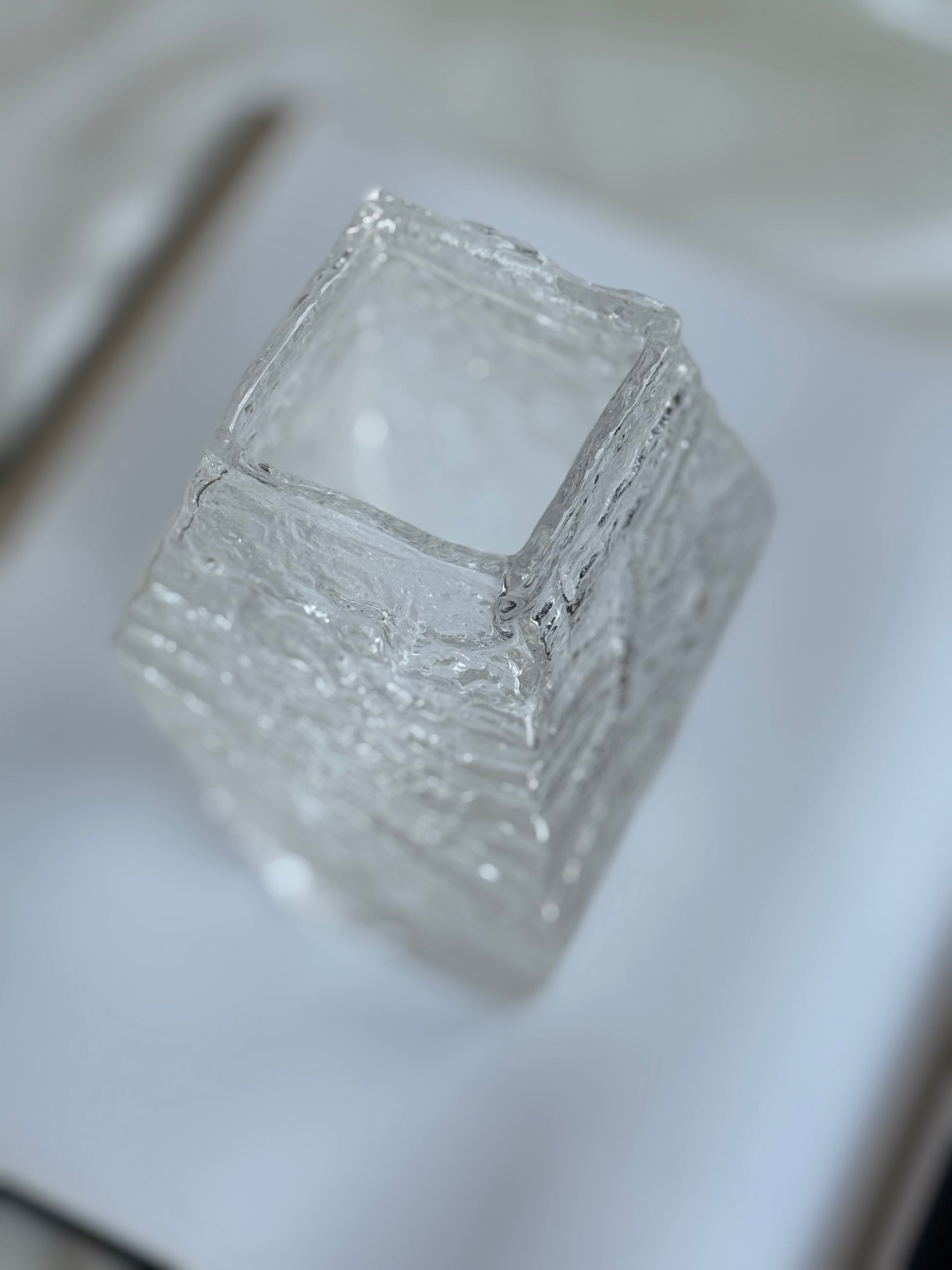 Sculptural vintage ice glass vase with a raw, frozen texture that beautifully refracts light. The thick, clear glass gives it a carved-from-ice appearance, creating a striking modernist silhouette.