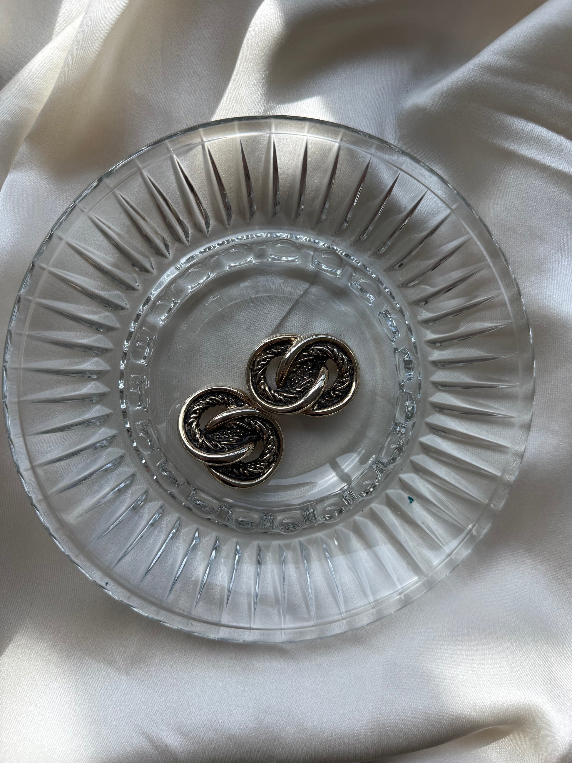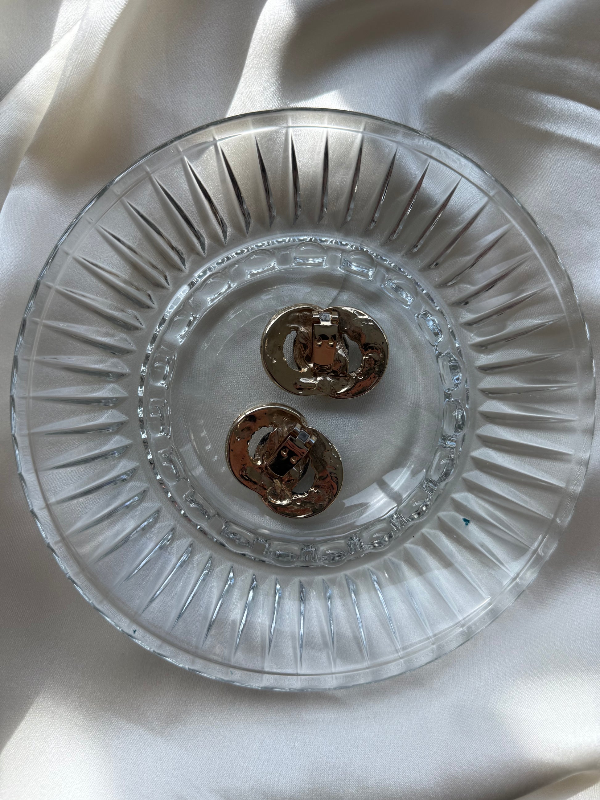 Elegant vintage shoe clips crafted in France, featuring an interlocking oval motif with subtle textured detailing. The warm gold-tone finish adds a touch of Parisian sophistication, making them a versatile statement accessory.