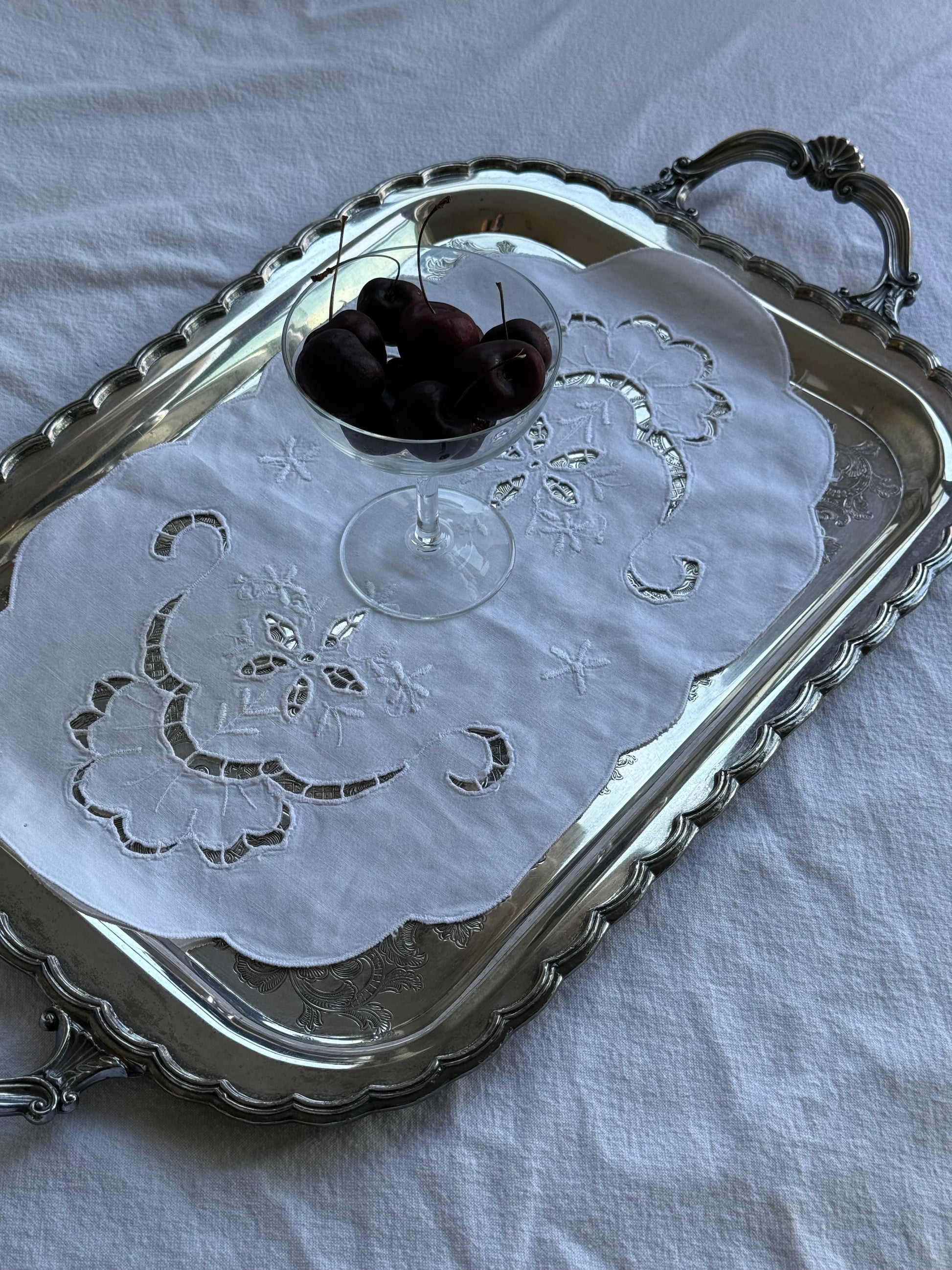 Add timeless elegance to your home with this beautifully crafted vintage silver-plated serving tray. Featuring ornate handles and intricate engraved detailing, this piece is both functional and decorative.